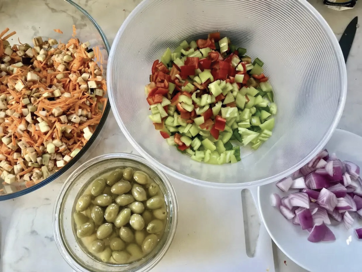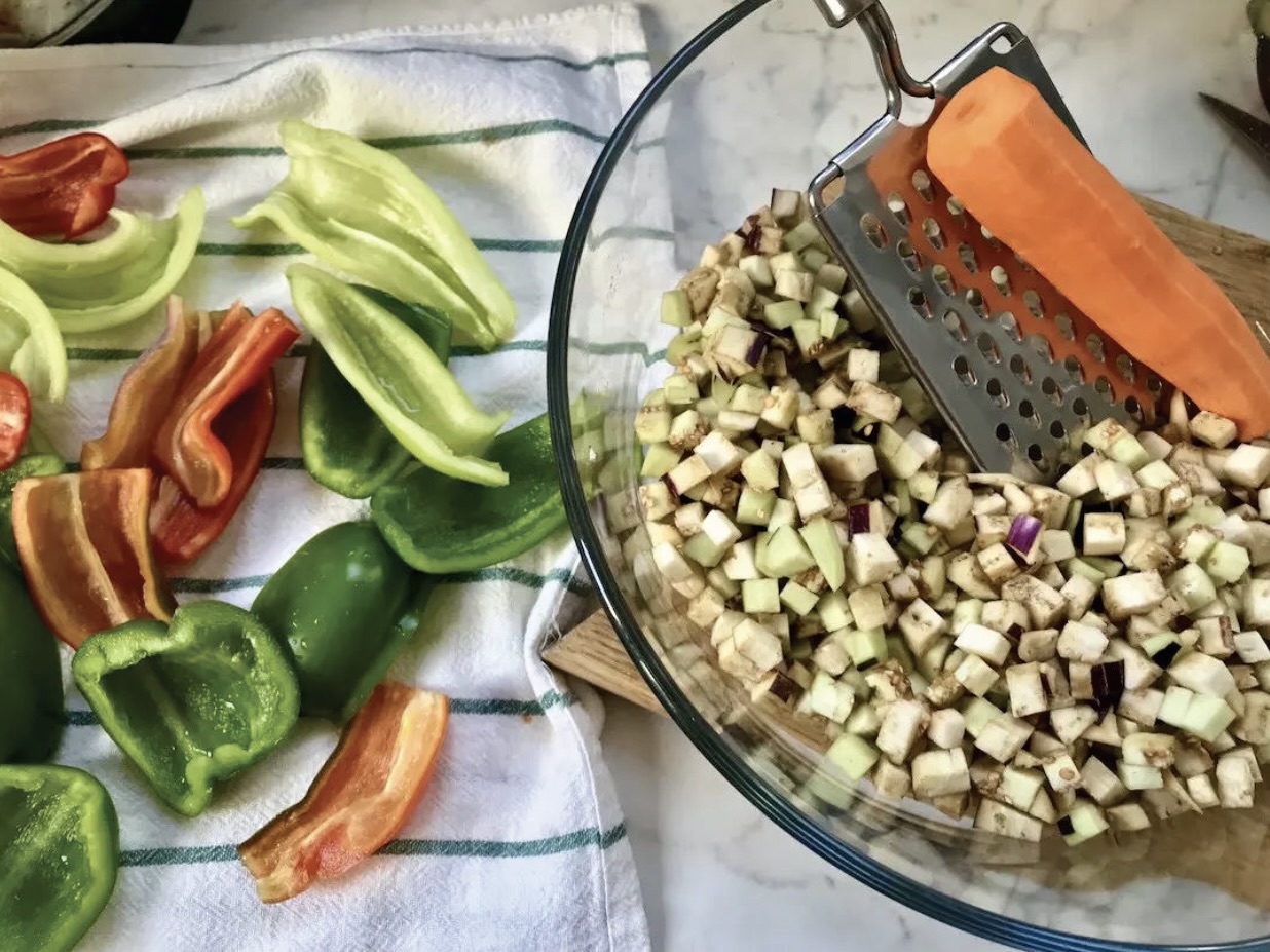 Przełóż bakłażana i marchewkę do miski z pozostałymi składnikami.