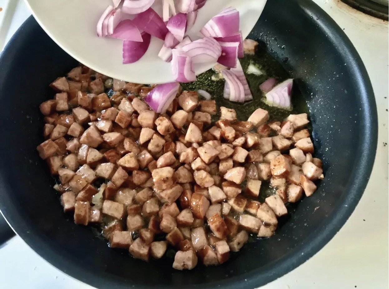 Kiełbasę pokrój w drobną kostkę i smaż na oliwie, aż lekko się zrumieni.
