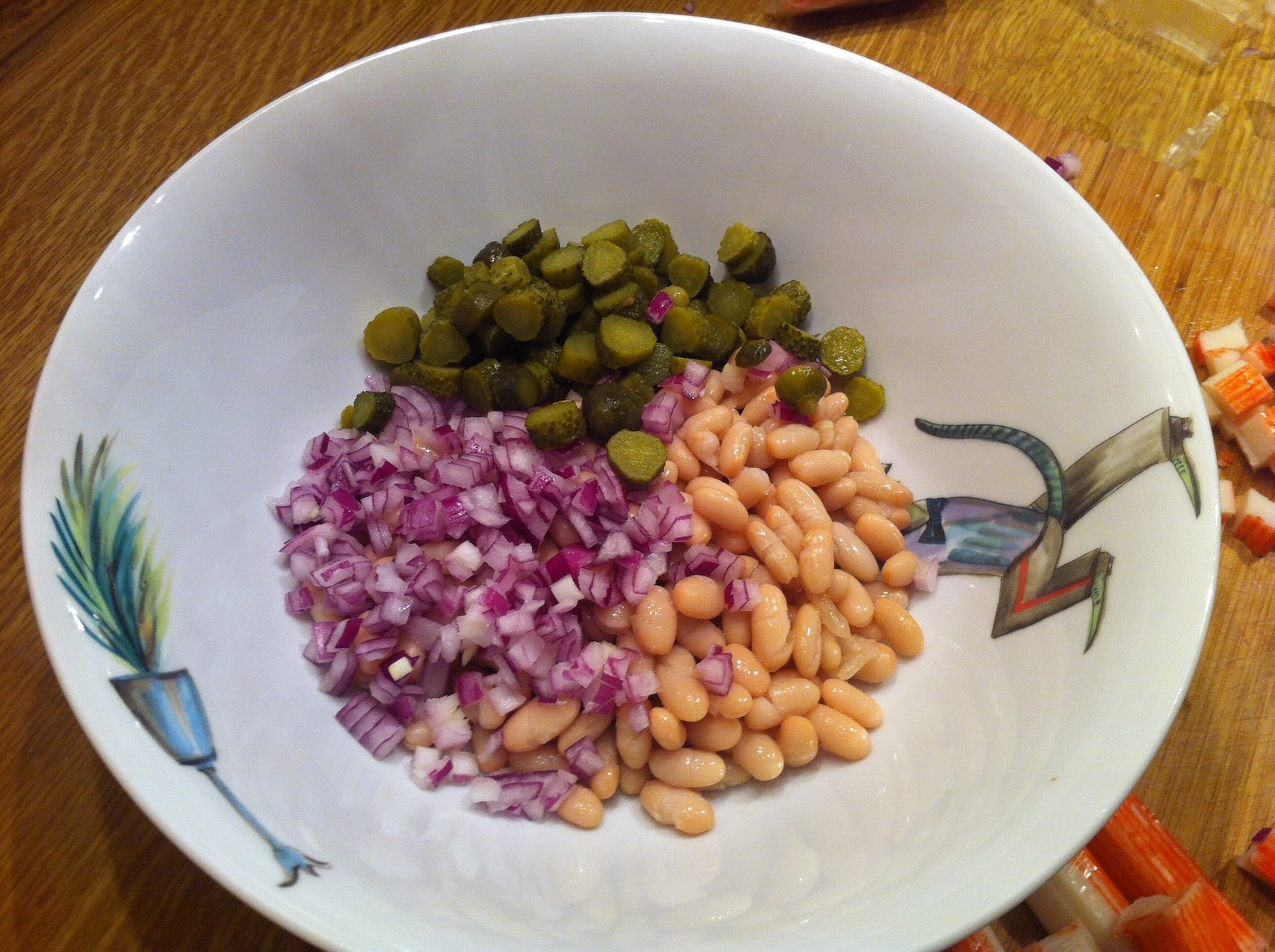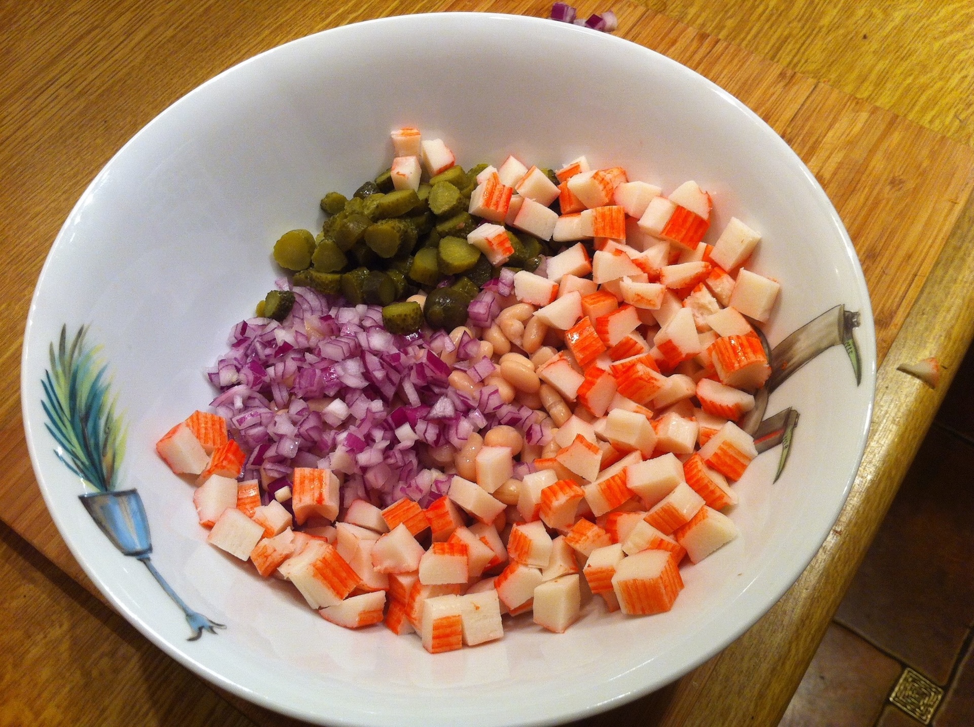 Fasolka: Wyjmij fasolkę z puszki, dokładnie przepłucz pod bieżącą wodą, odsącz i dodaj do surimi.