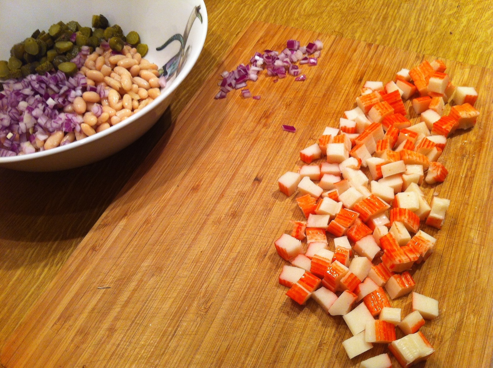Surimi: Wyjmij paluszki z opakowania i pokrój je w drobną kostkę. Przełóż do dużej miski.