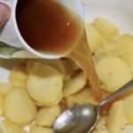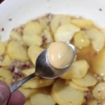 Dodanie bulionu: Wlej bulion wołowy do ziemniaków. Proponowana ilość to około 150 ml na początek. Autor preferuje, gdy sałatka ma więcej sosu i jest rzadsza.