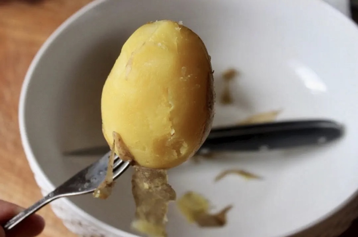 Gotowanie ziemniaków: Ugotuj ziemniaki w mundurkach do miękkości (sprawdzaj cienkim nożem). Odcedź, lekko przestudź i jeszcze ciepłe obierz ze skórek.