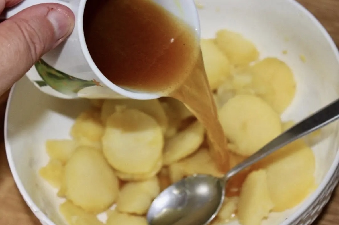 Dodanie bulionu: Wlej bulion wołowy do ziemniaków. Proponowana ilość to około 150 ml na początek. Autor preferuje, gdy sałatka ma więcej sosu i jest rzadsza.