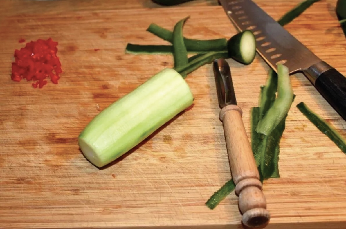 Ogórek: Obierz go ze skórki, przekrój wzdłuż i za pomocą łyżeczki usuń gniazda nasienne. Pozostały miąższ pokrój w drobną kostkę.