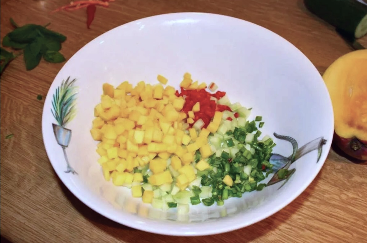 Mieszanie: W misce wymieszaj mango, ogórka, chilli oraz odrobinę posiekanej dymki. Odstaw na chwilę, aby smaki się przegryzły.