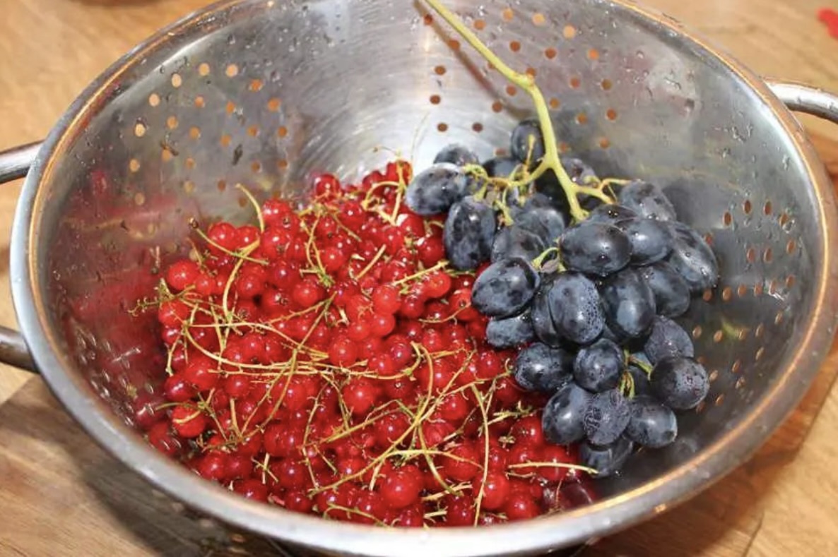 Autor poleca również dodatki sezonowe/lokalne: czerwone porzeczki, maliny, borówki lub czarne winogrona (owoce te puszczają pyszny sok).