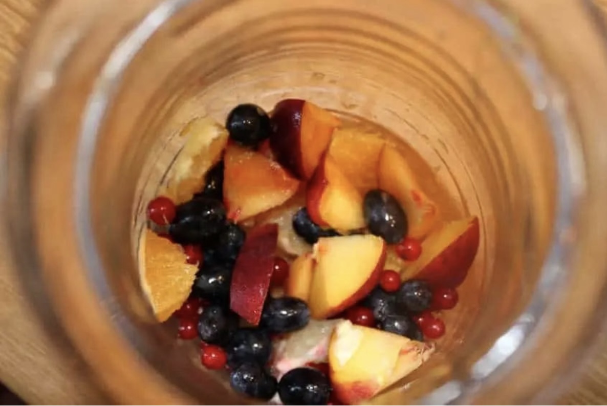 Owoce: Większe owoce pokrój na mniejsze kawałki i wrzuć do dużego dzbanka.