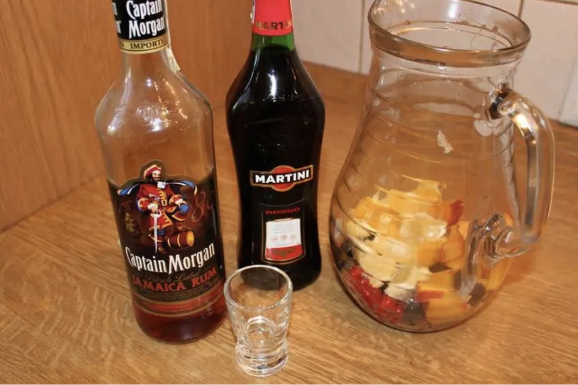 Mieszanie: Do dzbanka z owocami wlej alkohol wysokoprocentowy (rum/brandy/martini) oraz czerwone wino.