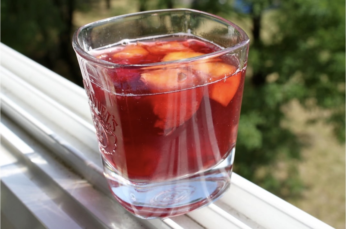 Sangria to chyba jeden z najbardziej znanych napojów alkoholowych w Hiszpanii. Sposobów „chłodzenia się” podczas upalnych dni jest wiele. Ja proponuję popijać napój lekki, który wspaniale gasi pragnienie. Ma tylko jedną wadę (sic!), zawiera alkohol, zatem popijać go można właściwie jedynie w dni wolne od pracy. Fruktoza z owoców winna dawać tyle słodyczy i kwaskowości, że absolutnie nie ma potrzeby dodawać cukru. Woda mineralna i dużo lodu to już mój dodatek, aby drink nie był zbyt mocny. Wszak nie chodzi o to, by się „znietrzeźwić”, lecz umysł schłodzić.