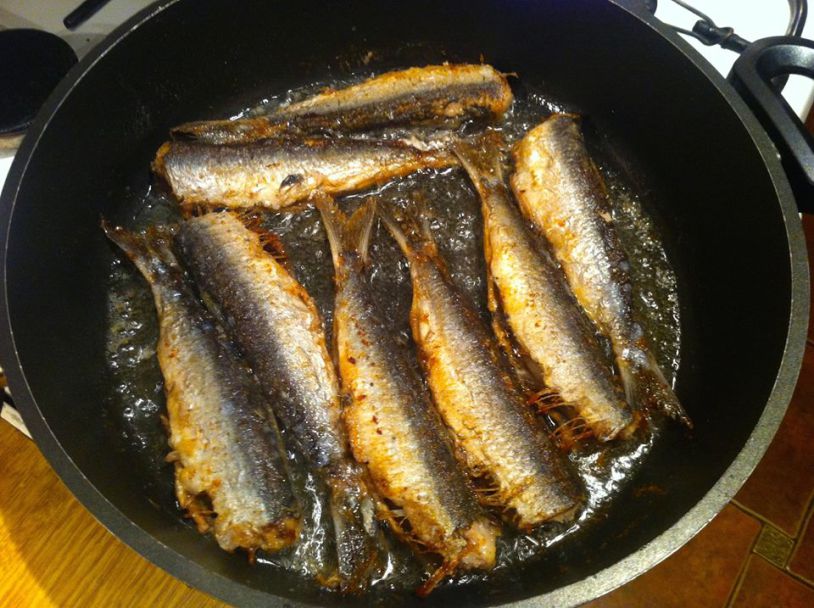 Kładź od razu na dobrze rozgrzaną patelnię. Sardynki trzeba smażyć w sporej ilości oliwy (nie musi to być oliwa extra vergine). Patelnia powinna być nagrzana, ale tłuszcz nie może „dymić” (optymalna temperatura to około 180°C).