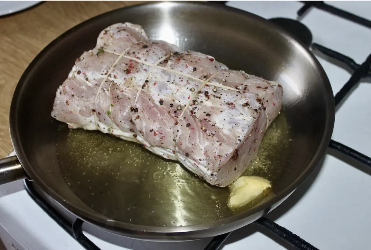 Obsmażanie: Na patelni rozpuść masło i oliwę, a następnie obsmaż schab na mocnym ogniu z każdej strony, aby go zrumienić i zamknąć pory mięsa.