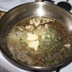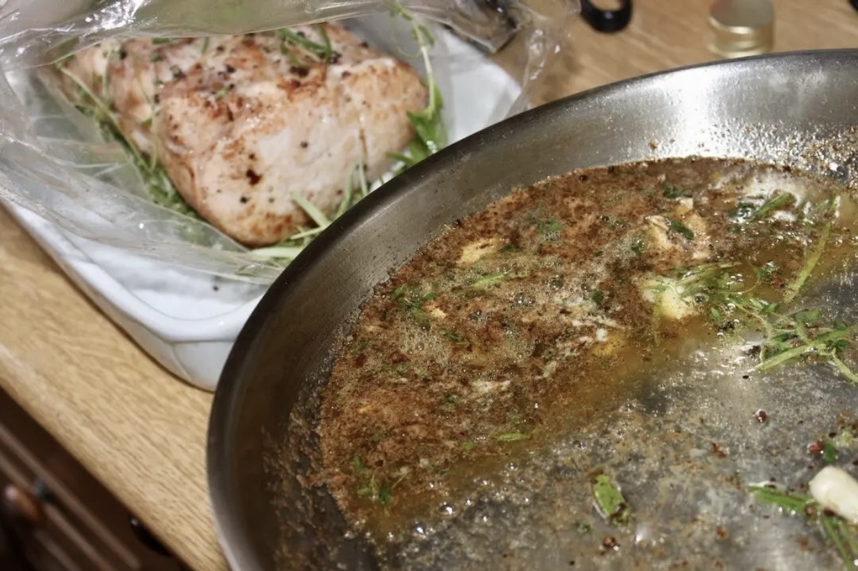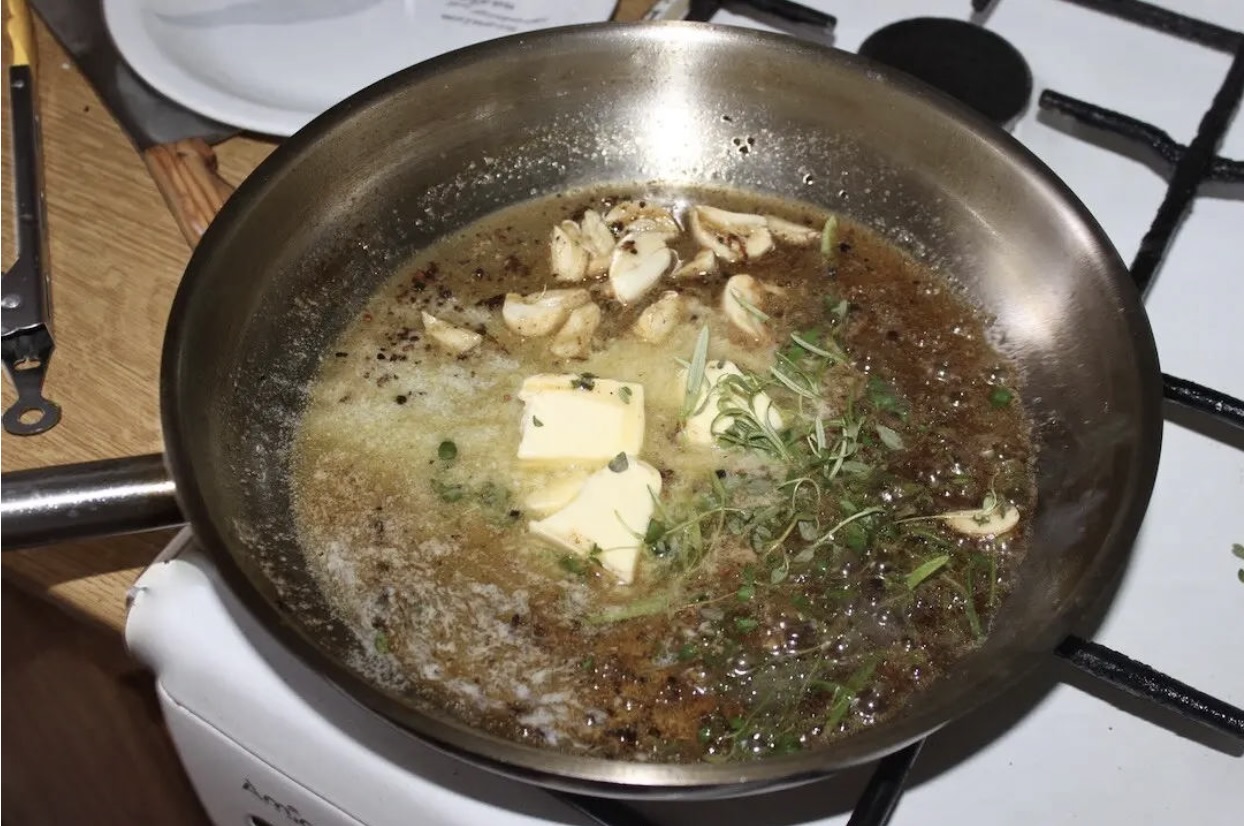 Przygotowanie sosu: Na tej samej patelni (po smażeniu mięsa) wrzuć 2 łyżki masła, rozmaryn, tymianek oraz obrane ząbki czosnku. Wlej pół szklanki gorącej wody i zeskrob tzw. „smaczek” z dna patelni. Gotuj krótko do uzyskania aromatycznej emulsji.