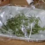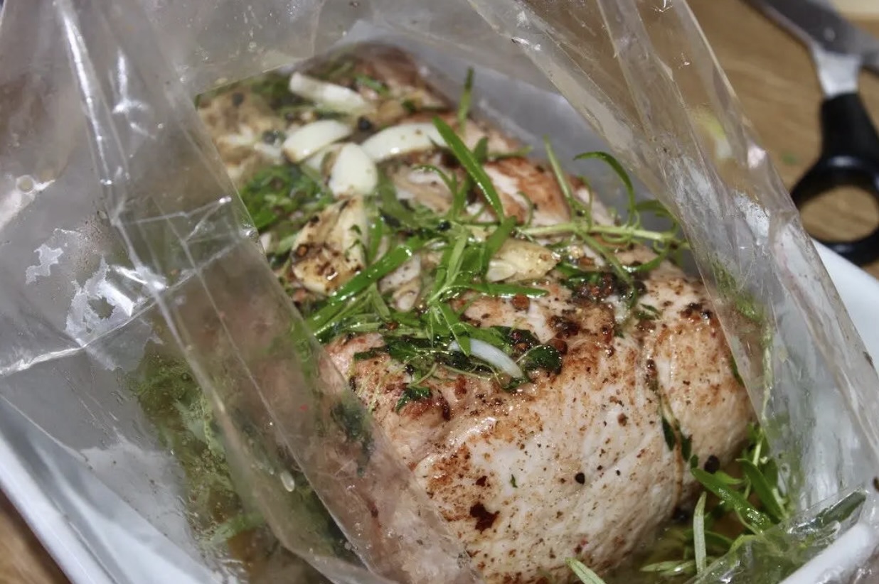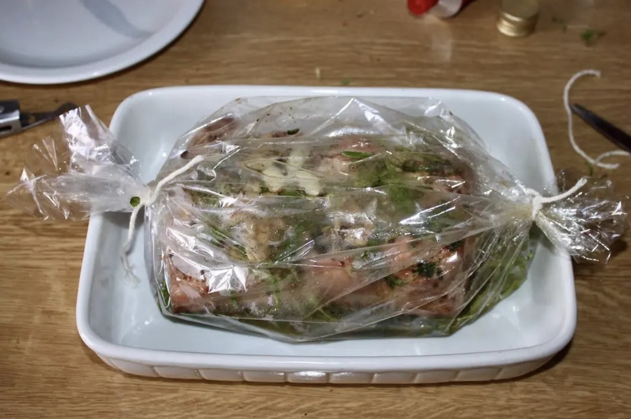 Przygotowanie rękawa: W naczyniu żaroodpornym rozłóż rękaw spożywczy i umieść w nim gałązki rozmarynu i tymianku. Przełóż obsmażone mięso na zioła.