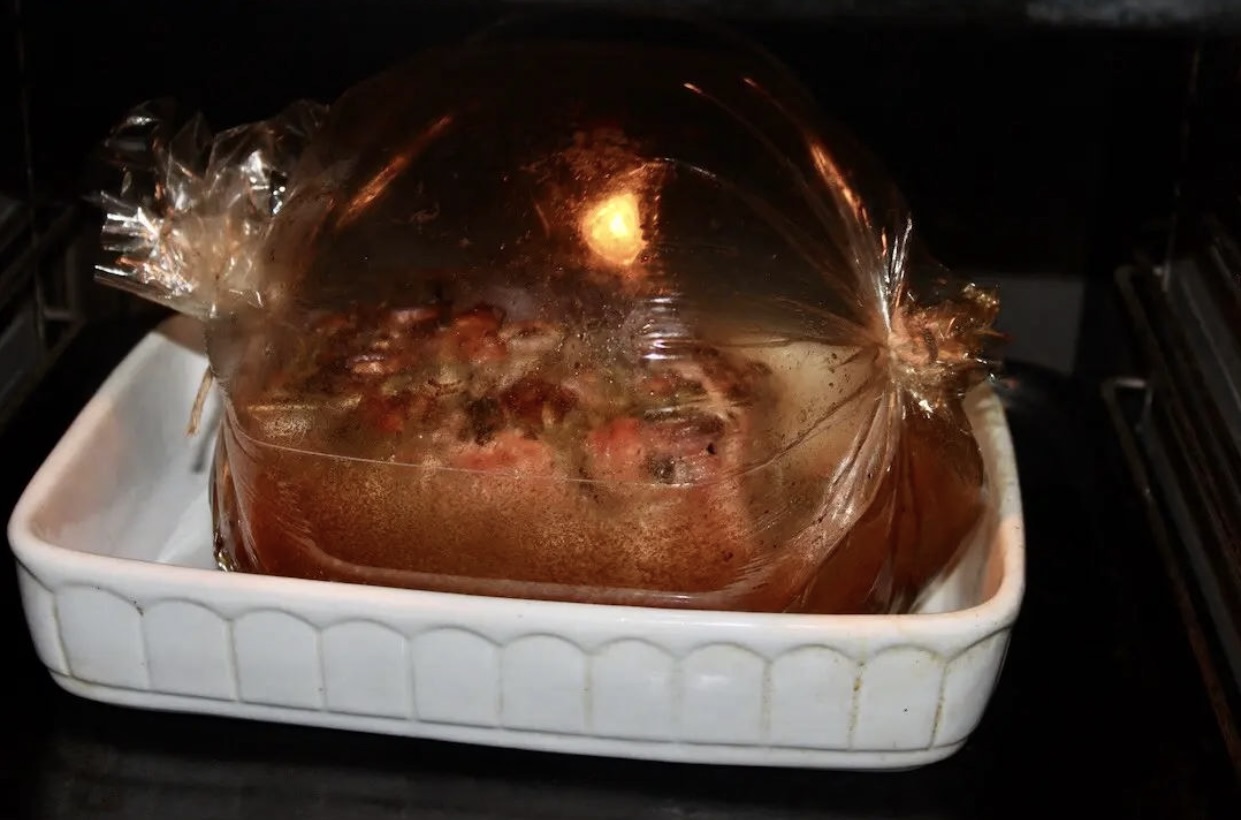 Pieczenie w rękawie: Przelej zawartość patelni do rękawa, polewając schab. Zamknij rękaw i wstaw do piekarnika nagrzanego do 180°C (z termoobiegiem) na około 1,5 godziny.