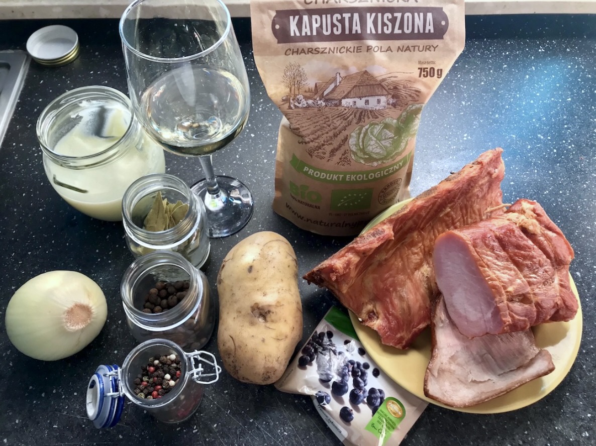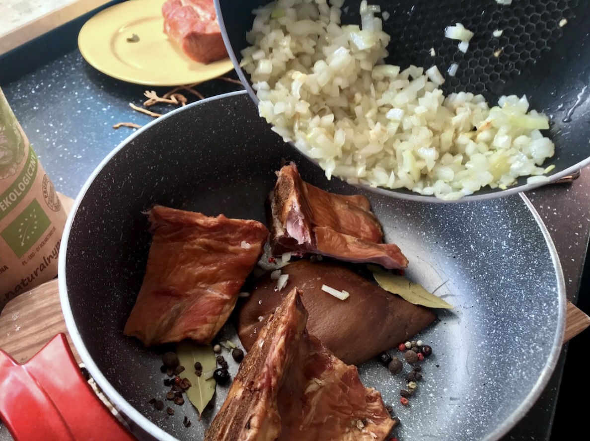 Przygotowanie bazy: Kości wędzone (najlepiej ze schabu) pokrój na kawałki i ułóż w garnku. Dodaj liście laurowe, pieprz ziarnisty, kulki jałowca oraz przesmażoną cebulę.