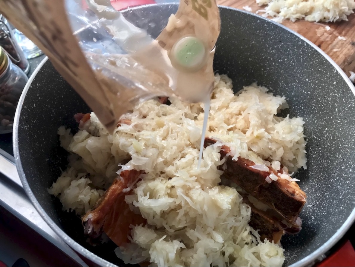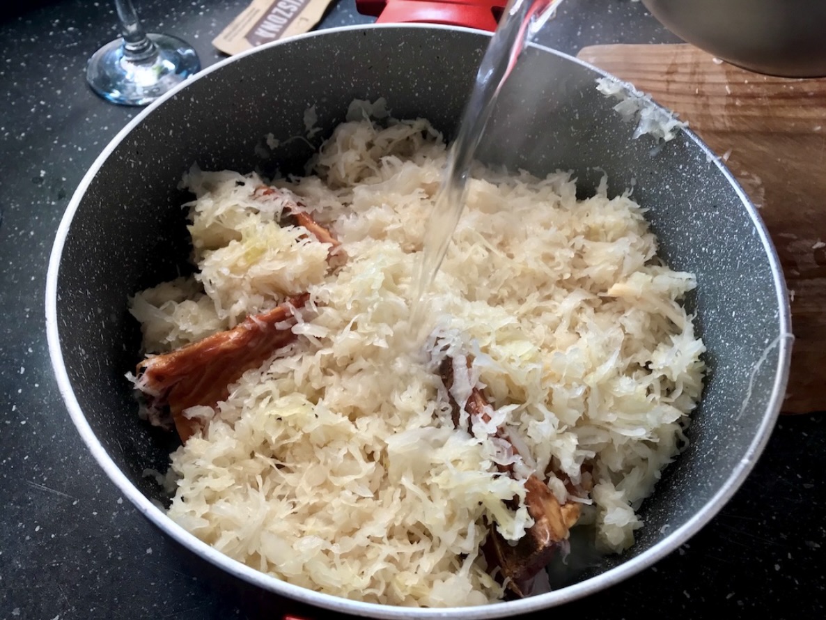 Duszenie kapusty: Przesiekaj kapustę kiszoną, a następnie włóż do garnka z kośćmi wędzonymi. Wlej sok z kapusty oraz 100 ml białego wina i około 500 ml wody. Przykryj garnek i duś na wolnym ogniu przez 15 minut.
