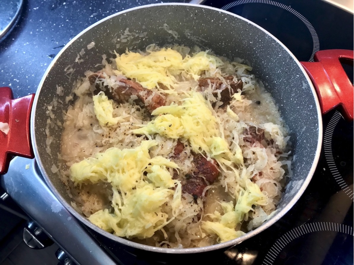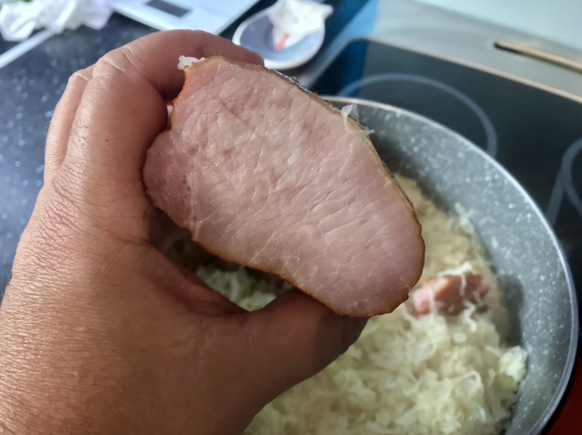 Duszenie schabu: Po 15 minutach włóż kawałek surowego wędzonego schabu do garnka, a następnie przykryj go kapustą. Całość dobrze posyp pieprzem, przykryj garnek i duś na wolnym ogniu przez kolejne 45 minut.