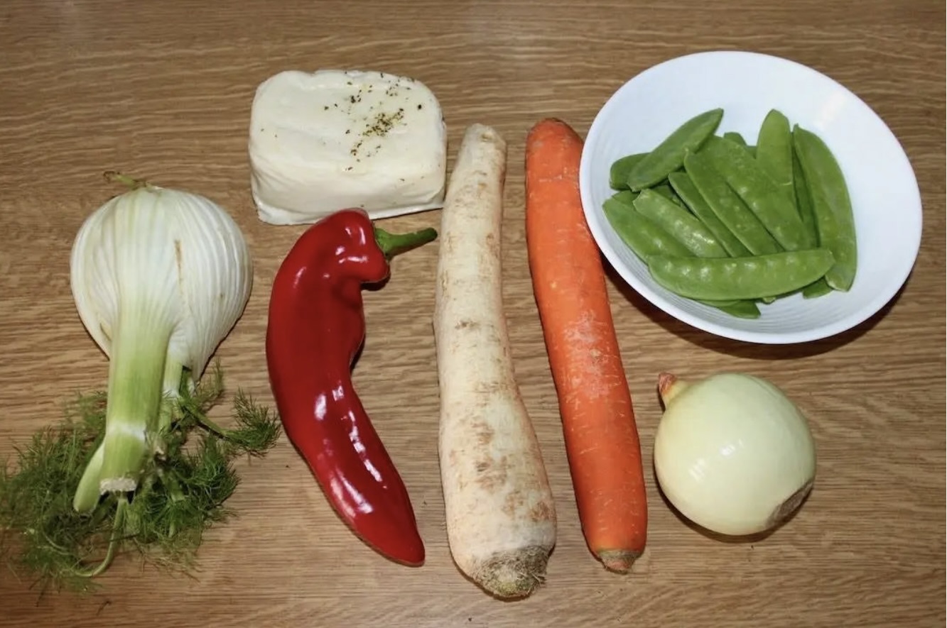 Podawaj ser na ciepło z warzywami i listkami świeżej mięty.
