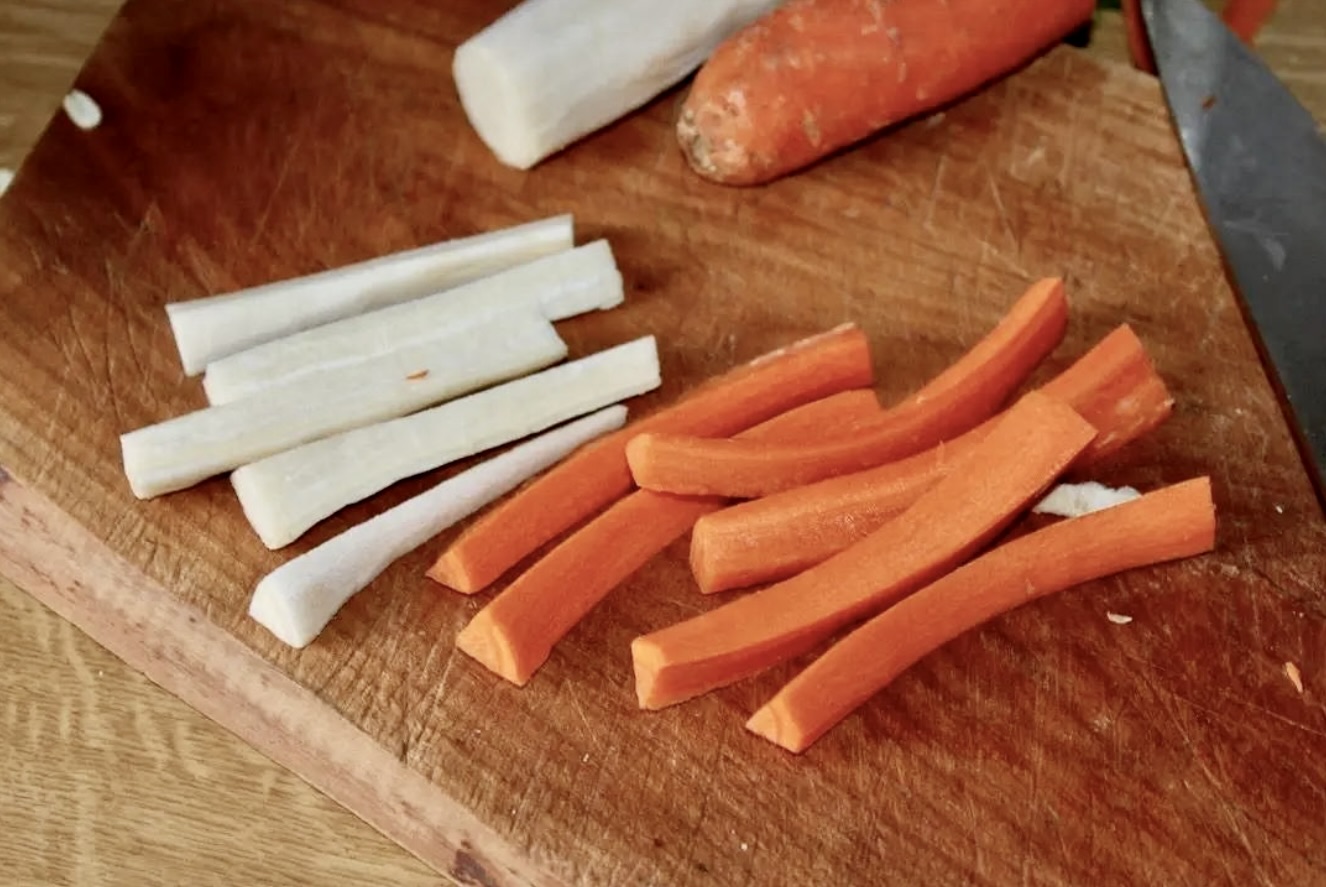 Marchewkę i pietruszkę obierz i pokrój w wąskie paski (warzywa korzeniowe są twardsze, więc możesz je pominąć lub zastąpić miększymi, jeśli wolisz).