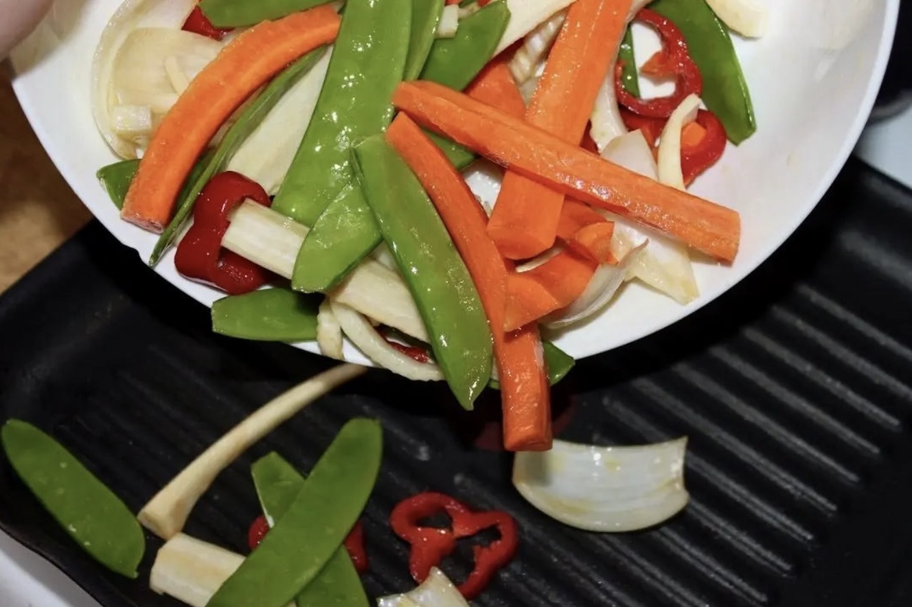 Mocno rozgrzej patelnię grillową (lub zwykłą), a następnie wrzuć na nią warzywa.