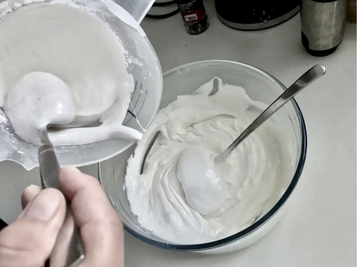 Pianę z białek dodawaj stopniowo do jogurtu i delikatnie mieszaj, aż powstanie jednolita masa.