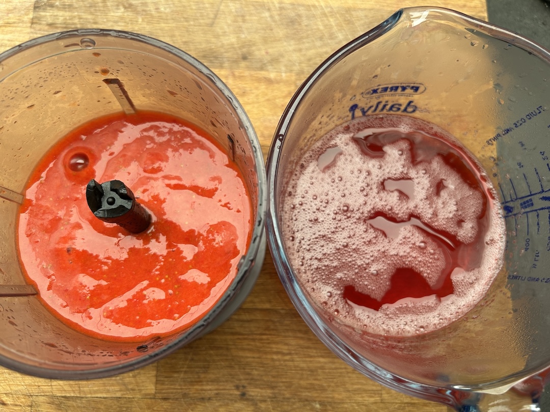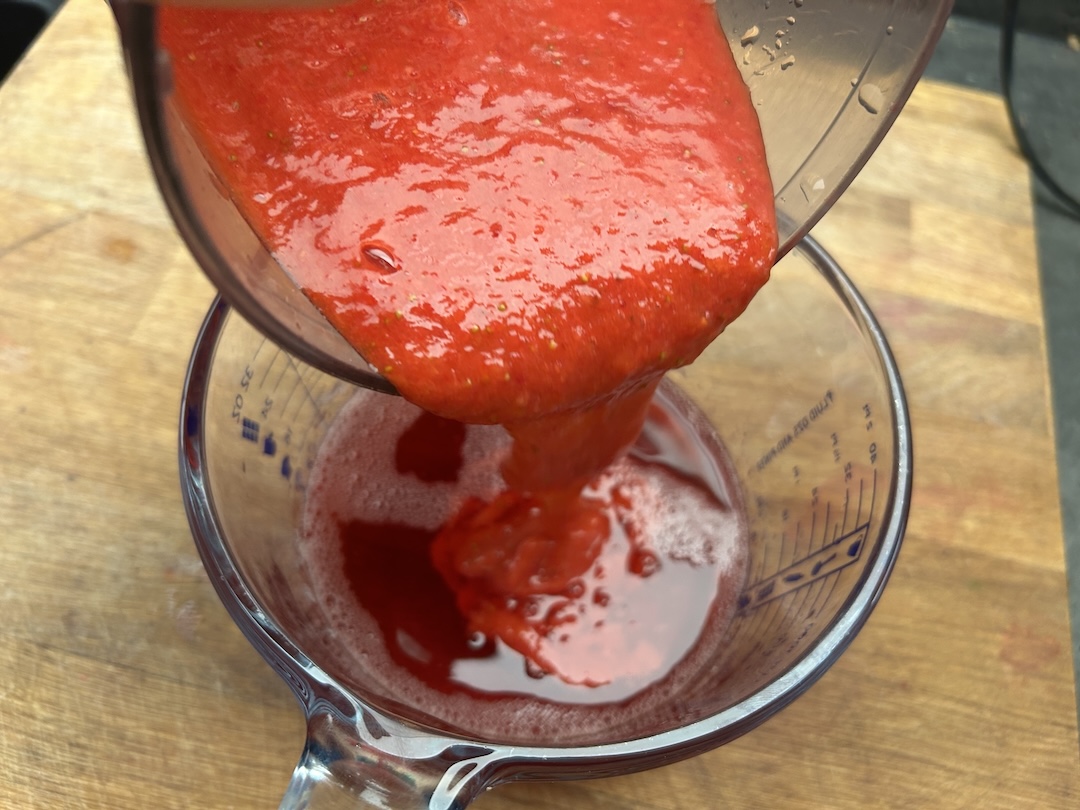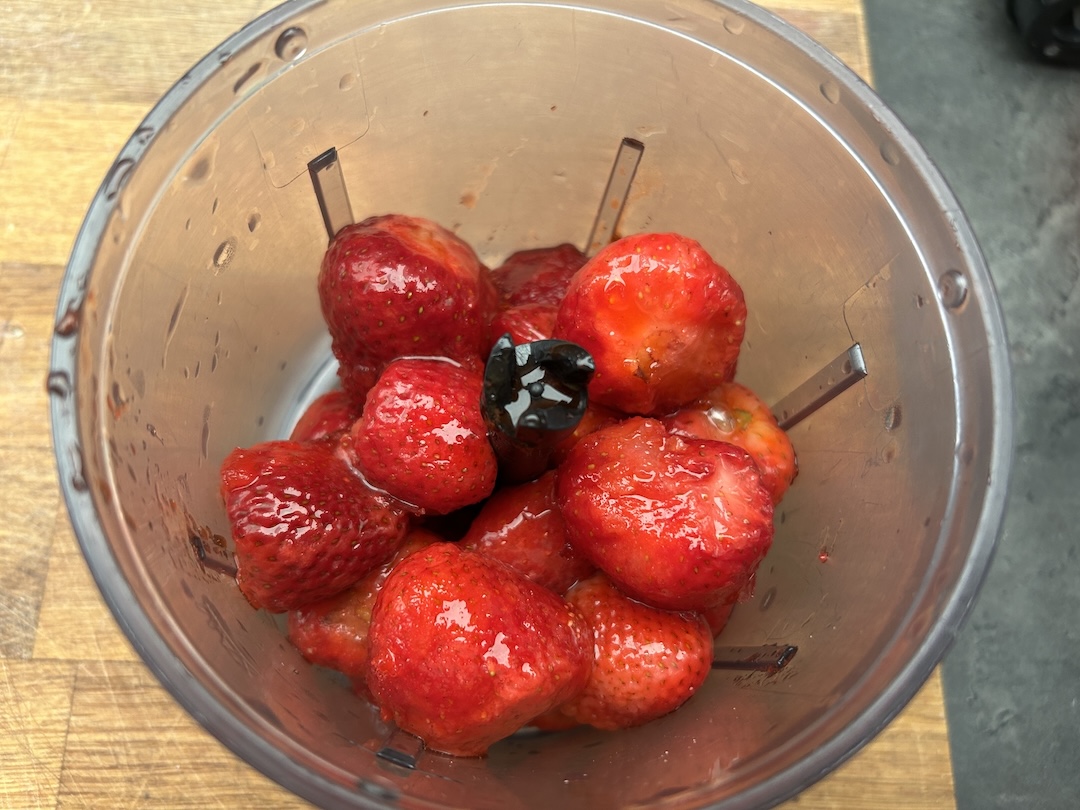 Gdy galaretka jest już zimna, ale jeszcze nie tężeje, dodaj do niej zmiksowane truskawki.