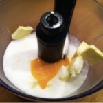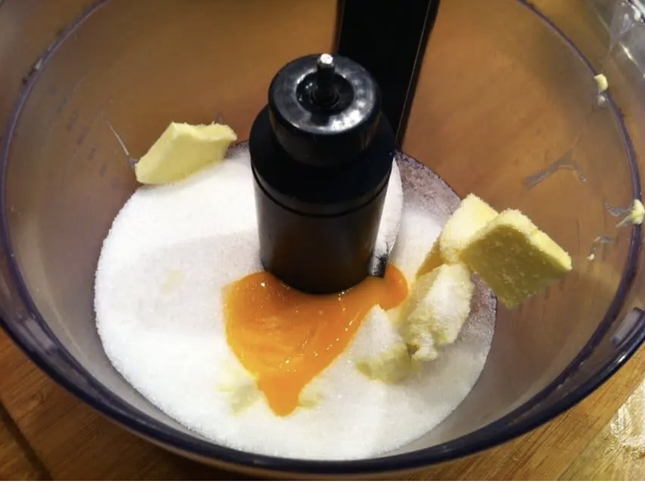Do miski malaksera wsyp szklankę cukru i włóż 100 gramów miękkiego masła. Dodaj 1 jajko i 1 żółtko. Zmiksuj, aż uzyskasz jednolitą masę.