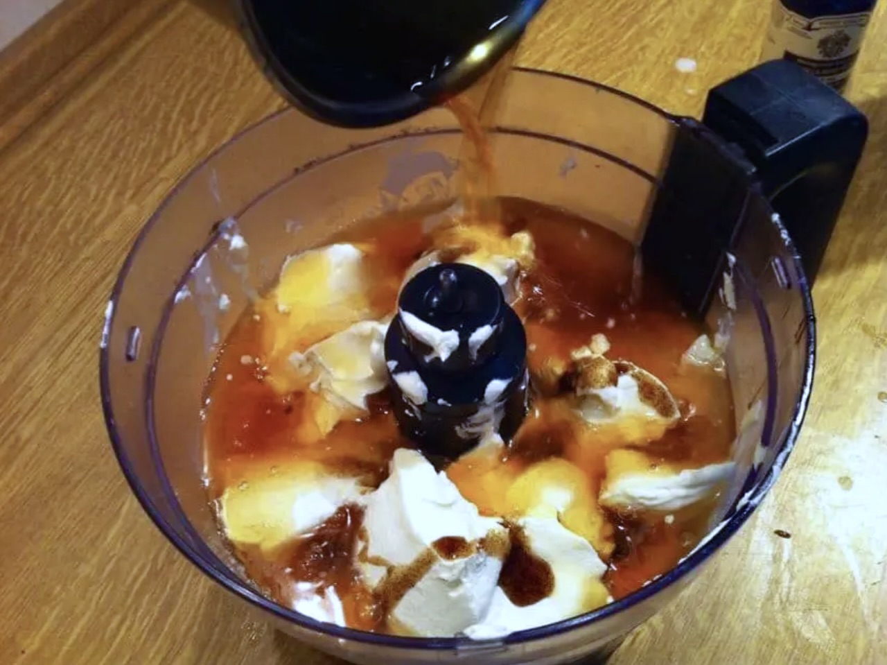 Dolej przestudzoną galaretkę brzoskwiniową. Zmiksuj wszystkie składniki na gładką, jednolitą masę.