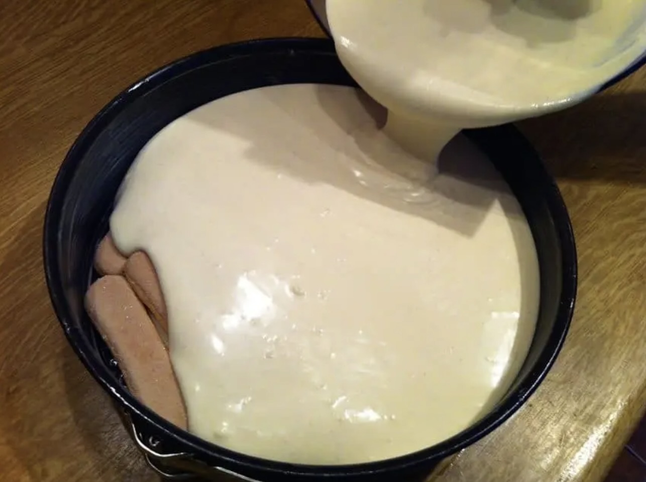 Tortownicę wysmaruj masłem. Na dnie rozłóż biszkopty. Można je wcześniej delikatnie namoczyć w mleku, aby były bardziej miękkie.