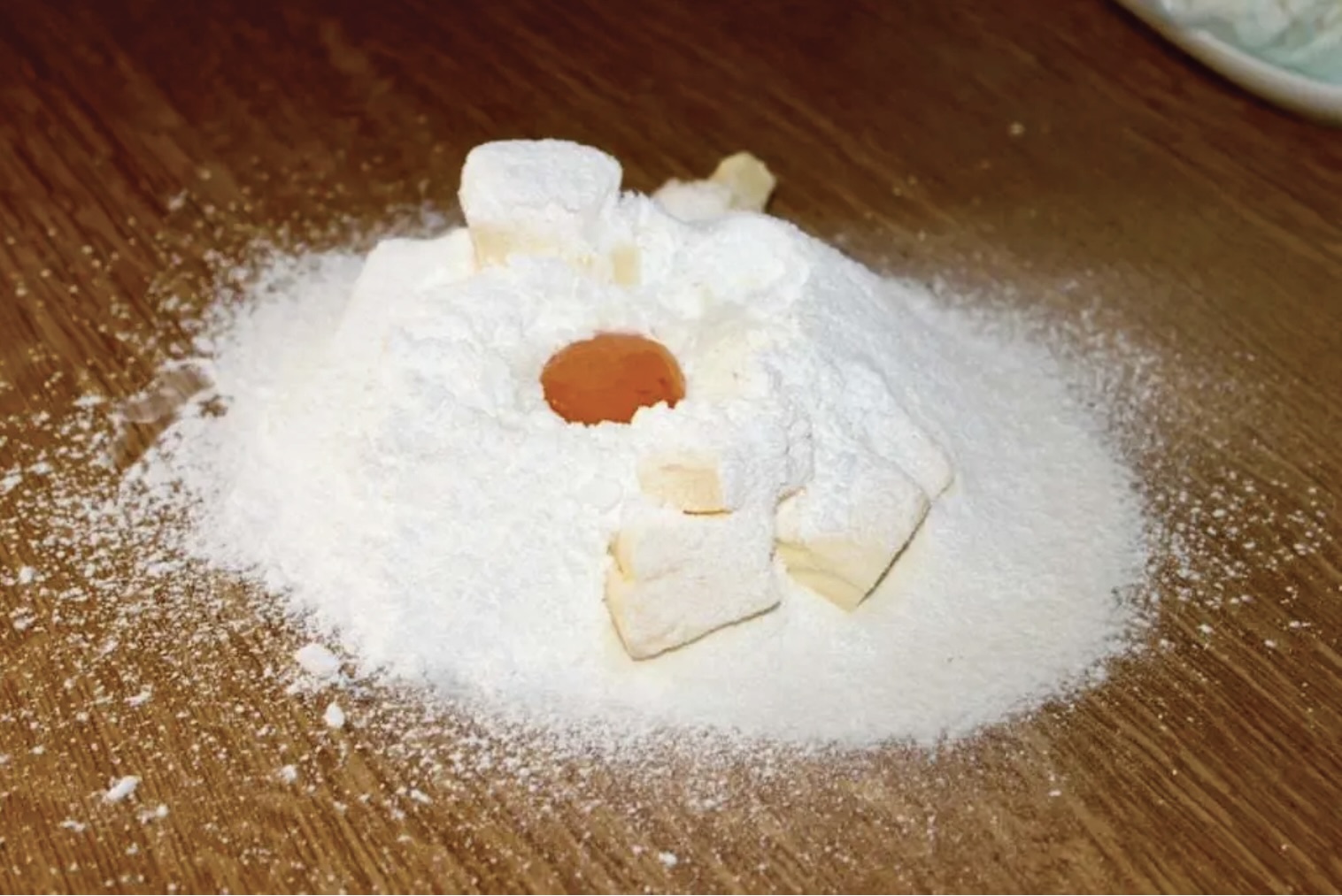 Dodaj 80 g zimnego masła, 50 g cukru pudru i 1 żółtko.