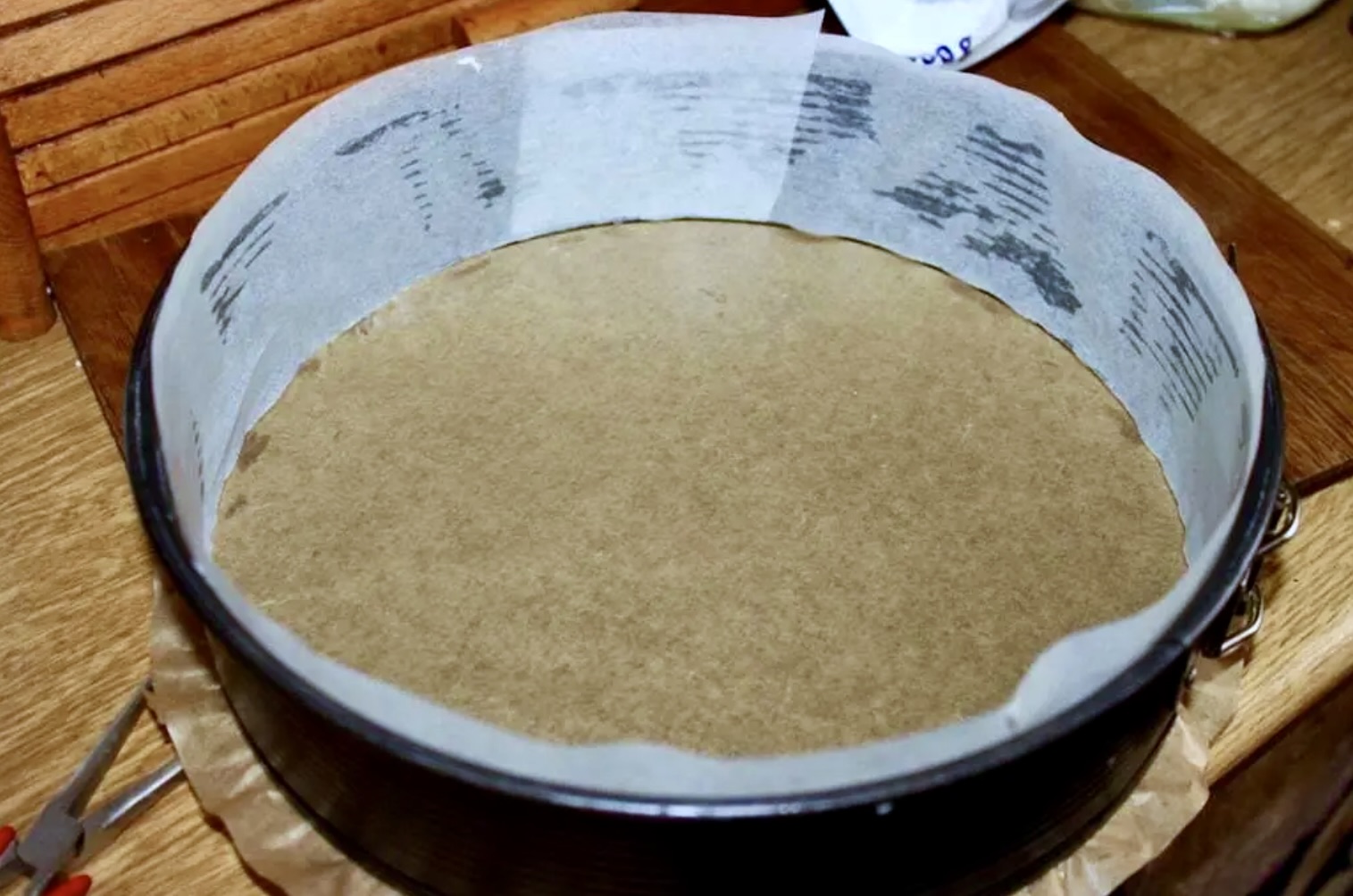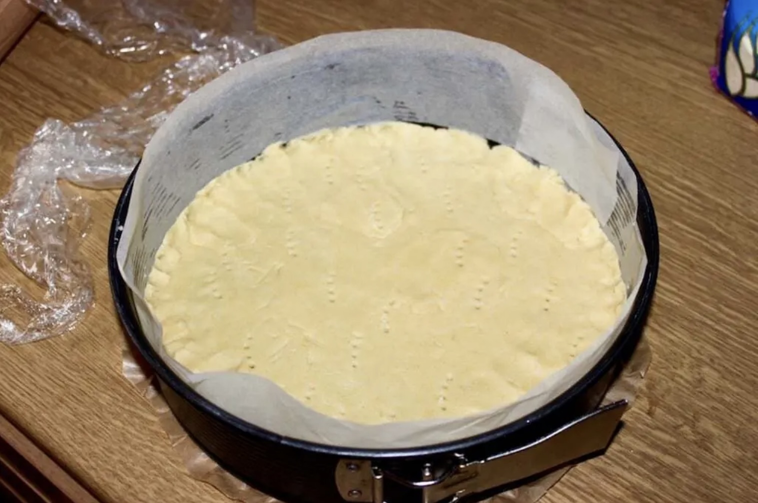 Jeśli robisz spód: Wyjmij kruche ciasto z lodówki, lekko rozwałkuj i ułóż na dnie tortownicy. Nakłuj widelcem i podpiecz w piekarniku nagrzanym do 180°C przez 10 minut.