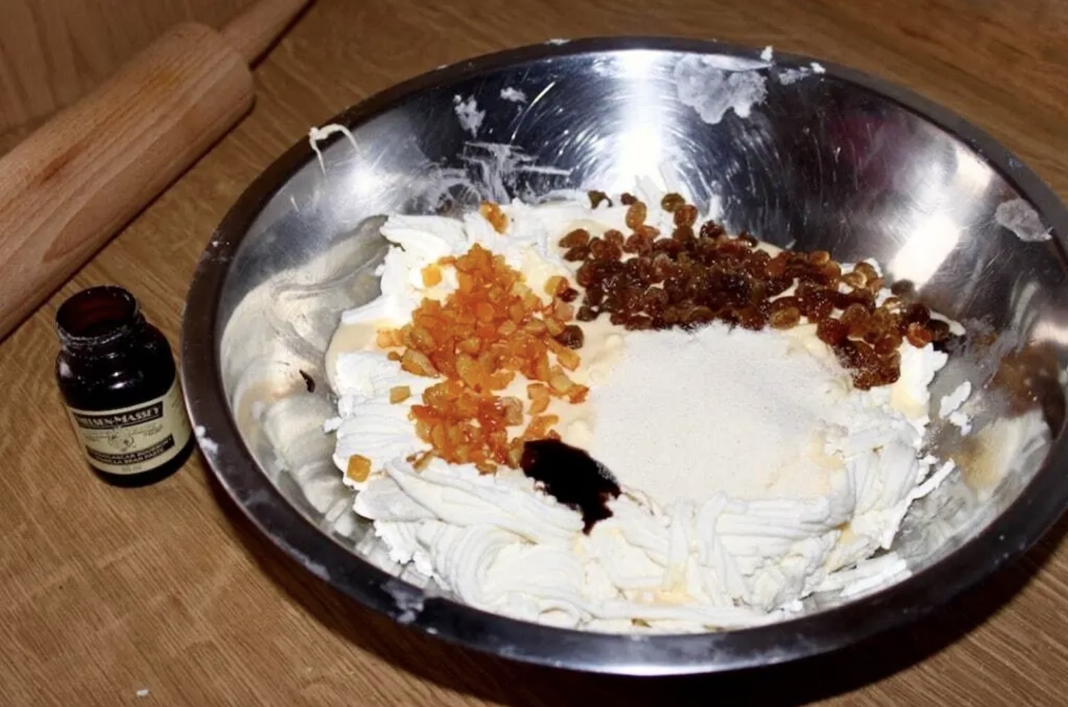Dodaj pastę waniliową/wanilię, kandyzowaną skórkę pomarańczową, namoczone rodzynki oraz 2 kopiaste łyżki grysiku (kaszy manny). Wymieszaj.
