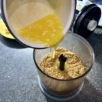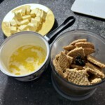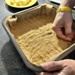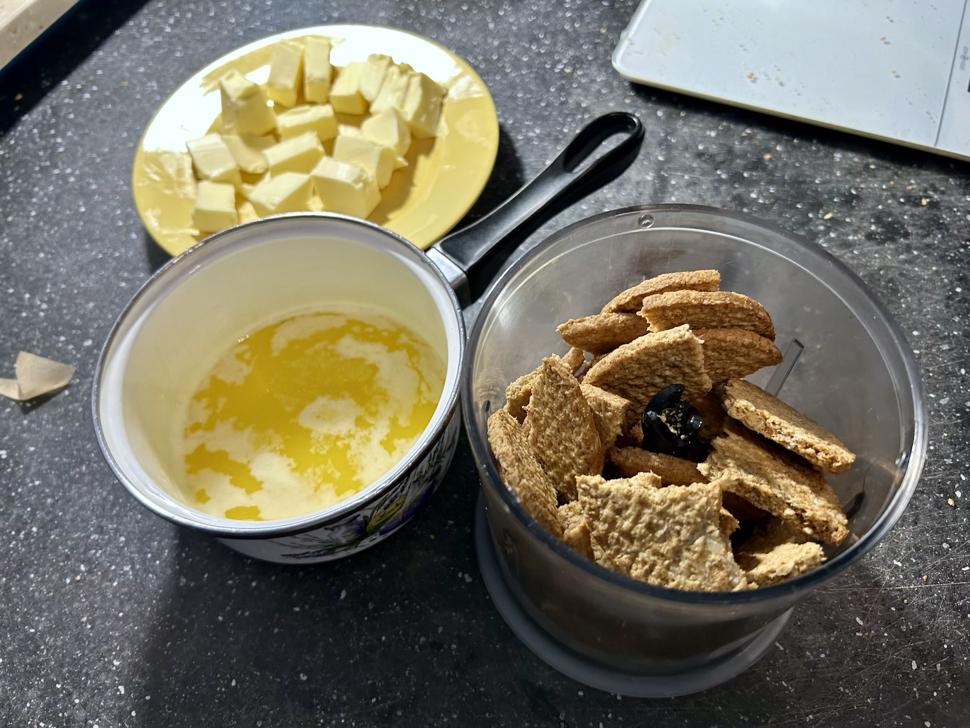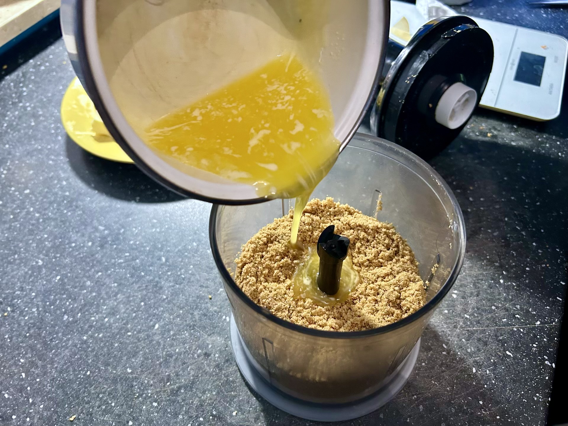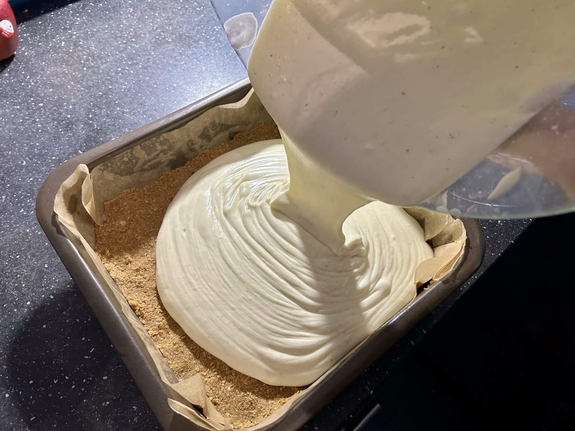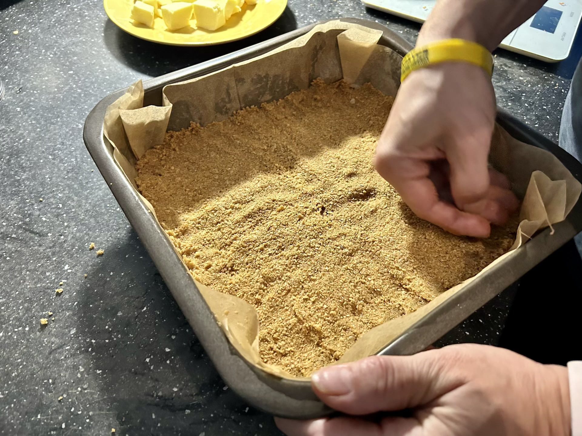 Spód: Ciastka zmiksuj na pył, wymieszaj z roztopionym masłem (i kakao). Wyłóż dno formy (22×22 cm lub tortownica 24 cm) wyłożonej papierem, ugnieć, a następnie wstaw do lodówki.