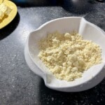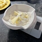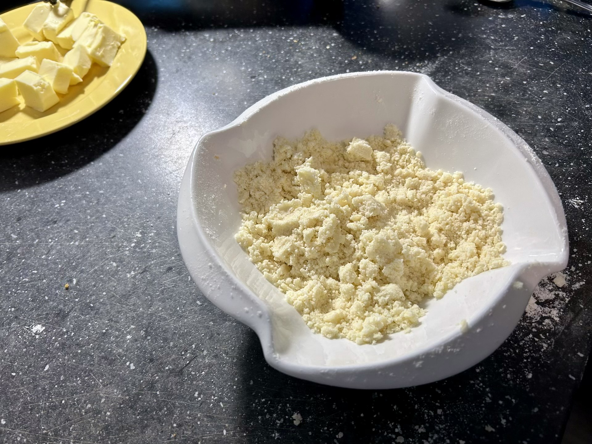 Kruszonka: Wymieszaj mąkę z cukrem, dodaj zimne masło i rozcieraj palcami do uzyskania grudek. Następnie wstaw do lodówki.