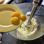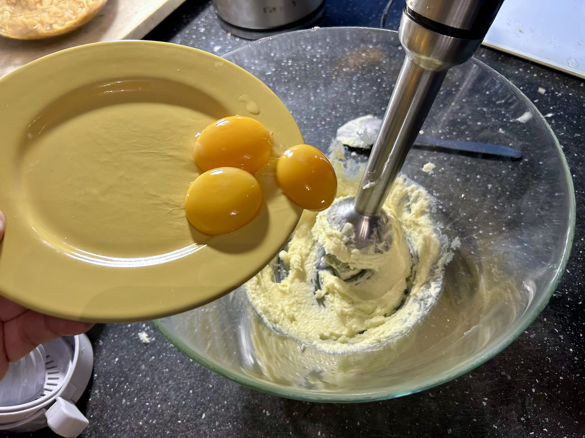 Utrzyj miękkie masło z 50 g cukru na puszystą masę. Dodawaj po jednym żółtku, cały czas miksując.