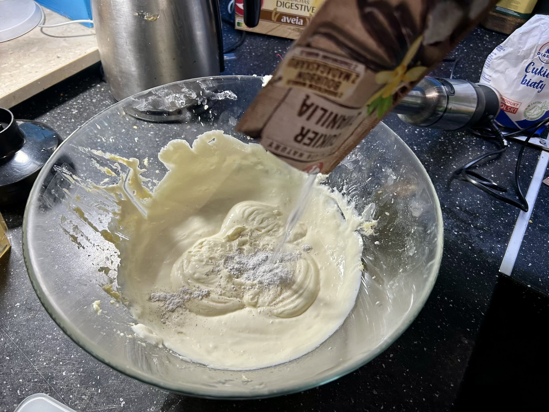 Dodawaj twaróg po łyżce, miksując na niskich obrotach. Na koniec wmieszaj budyń i cukier waniliowy.