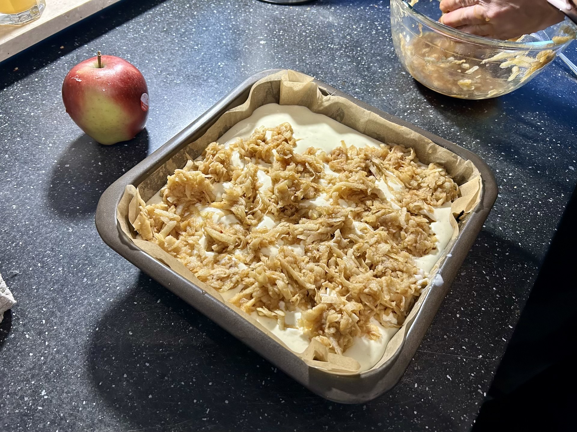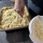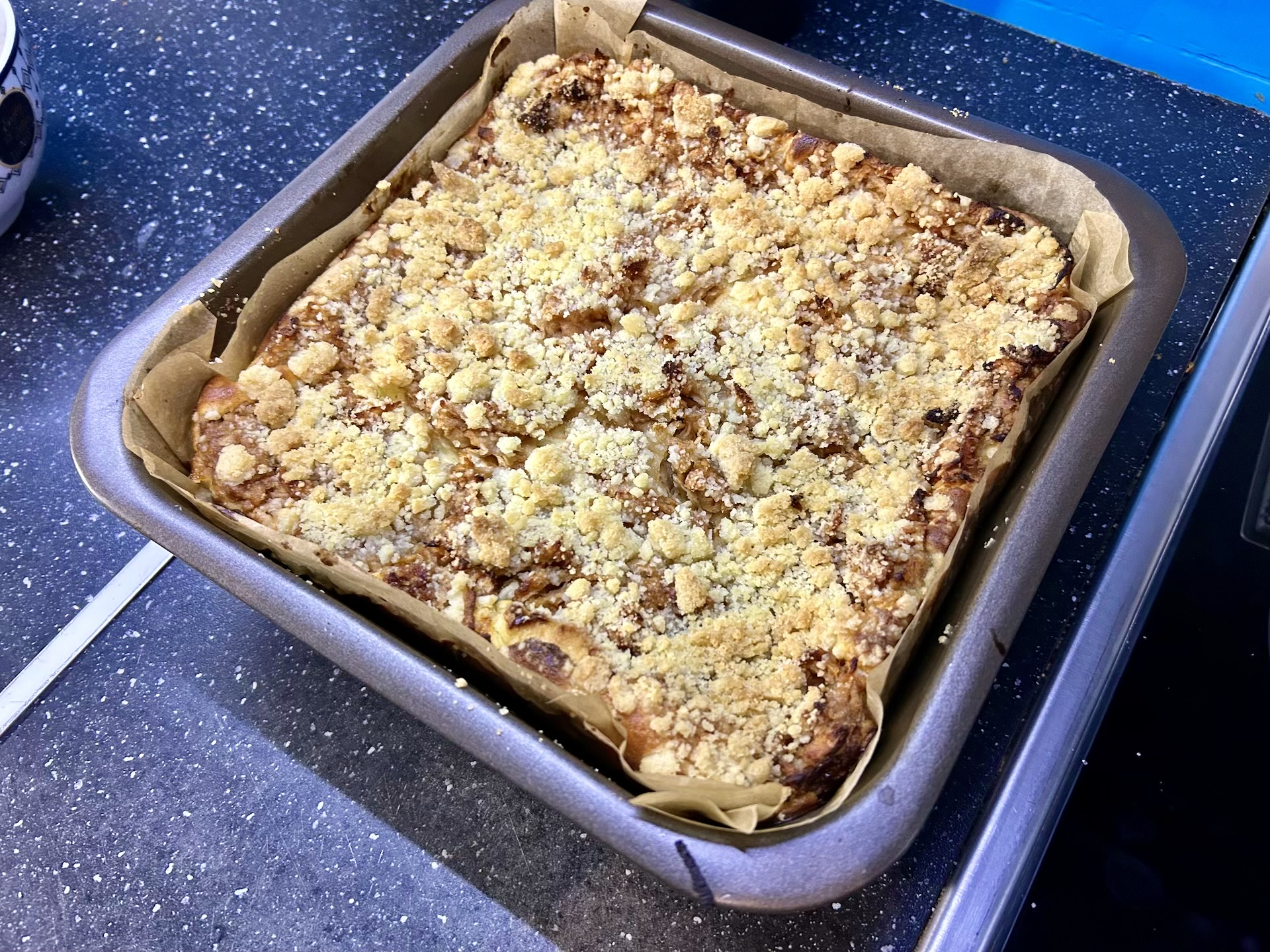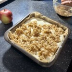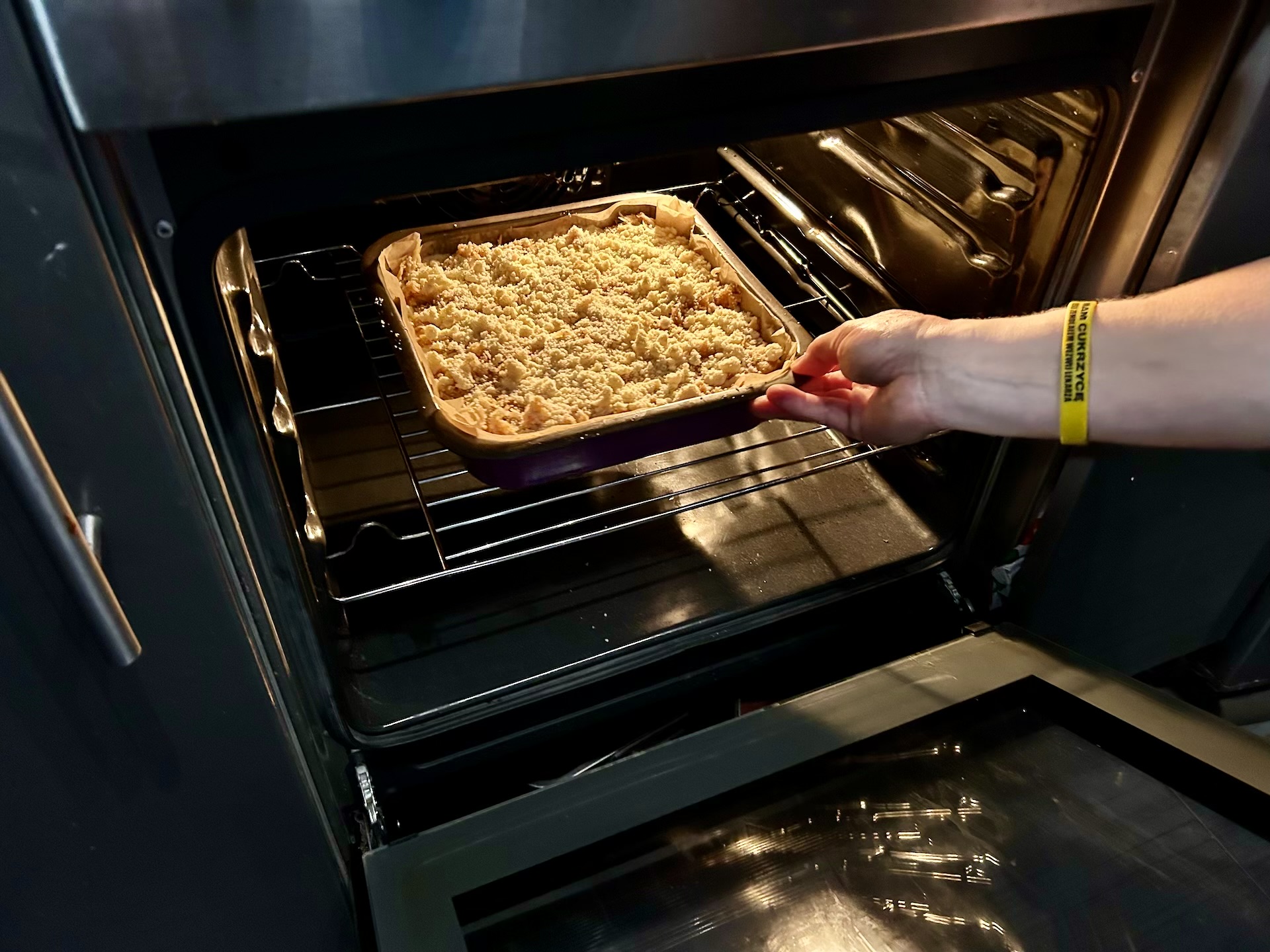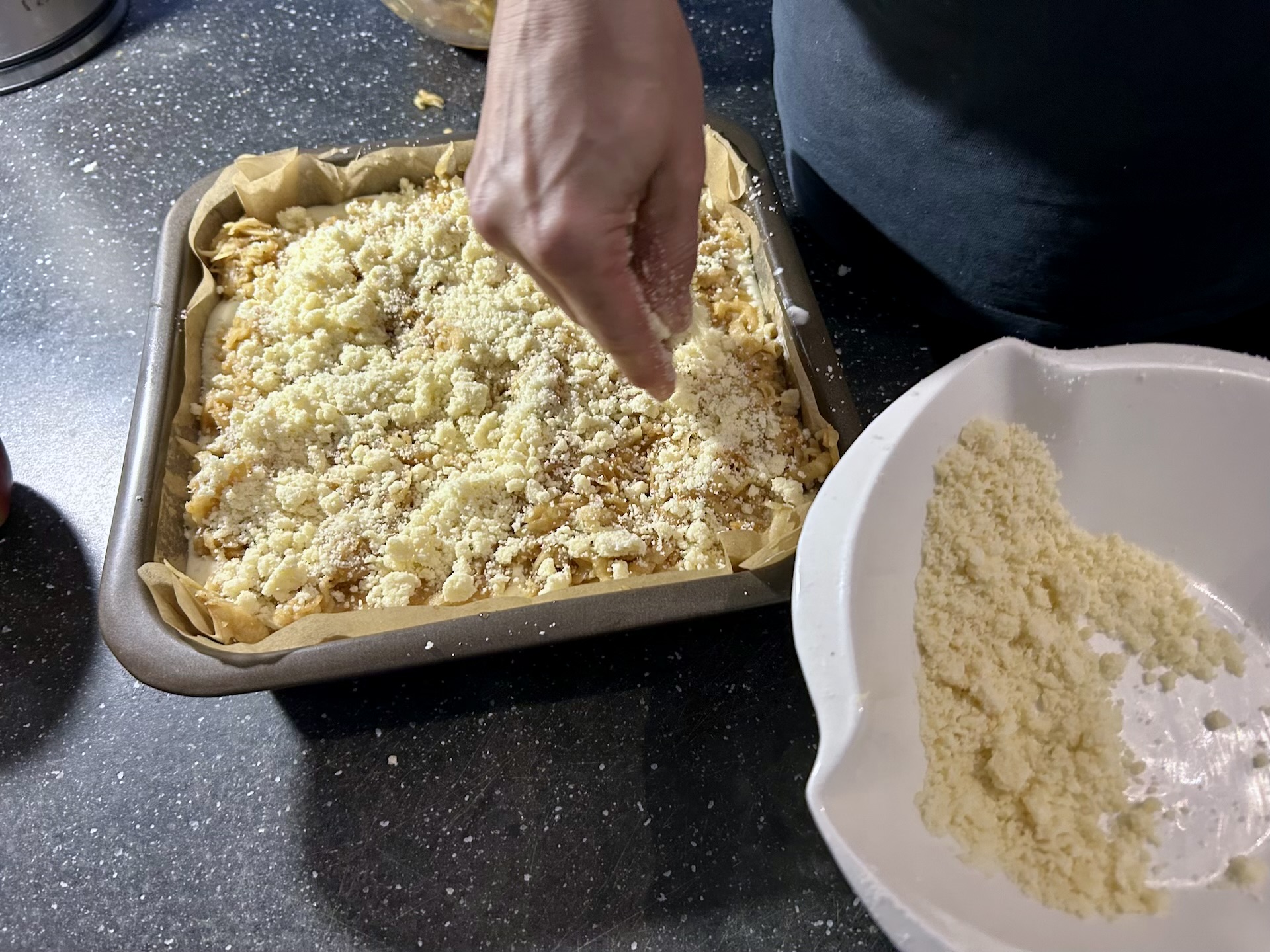 Składanie ciasta: Na schłodzony spód wylej masę serową. Na wierzchu rozłóż odciśnięte jabłka, a całość posyp kruszonką.