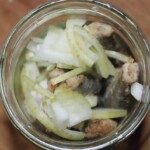 Do każdego słoika włóż nieco przestudzonej, przelanej wrzątkiem cebuli.