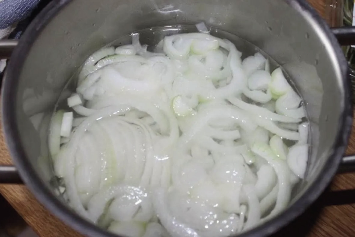 Cebule obierz, pokrój w piórka, a następnie zalej wrzątkiem. Po 1 minucie odcedź i pozostaw do przestygnięcia. Ten zabieg ma na celu zmiękczenie cebuli i pozbawienie jej nadmiernej ostrości.