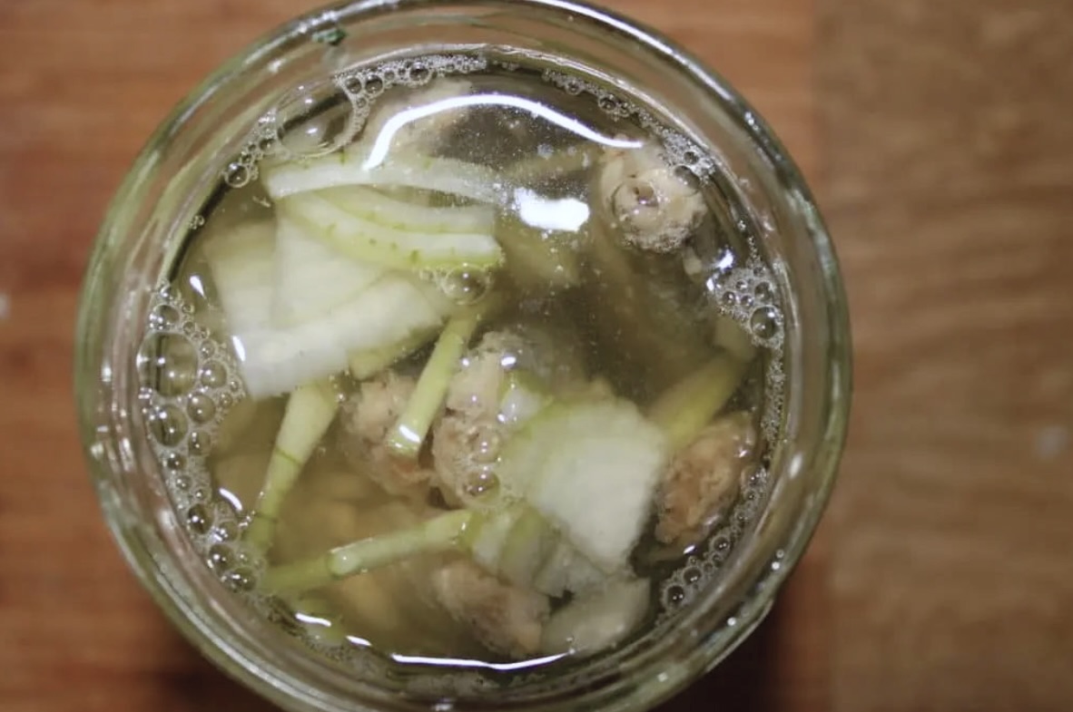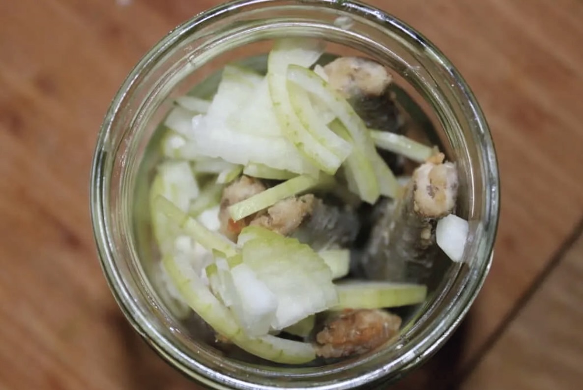 Do każdego słoika włóż nieco przestudzonej, przelanej wrzątkiem cebuli.