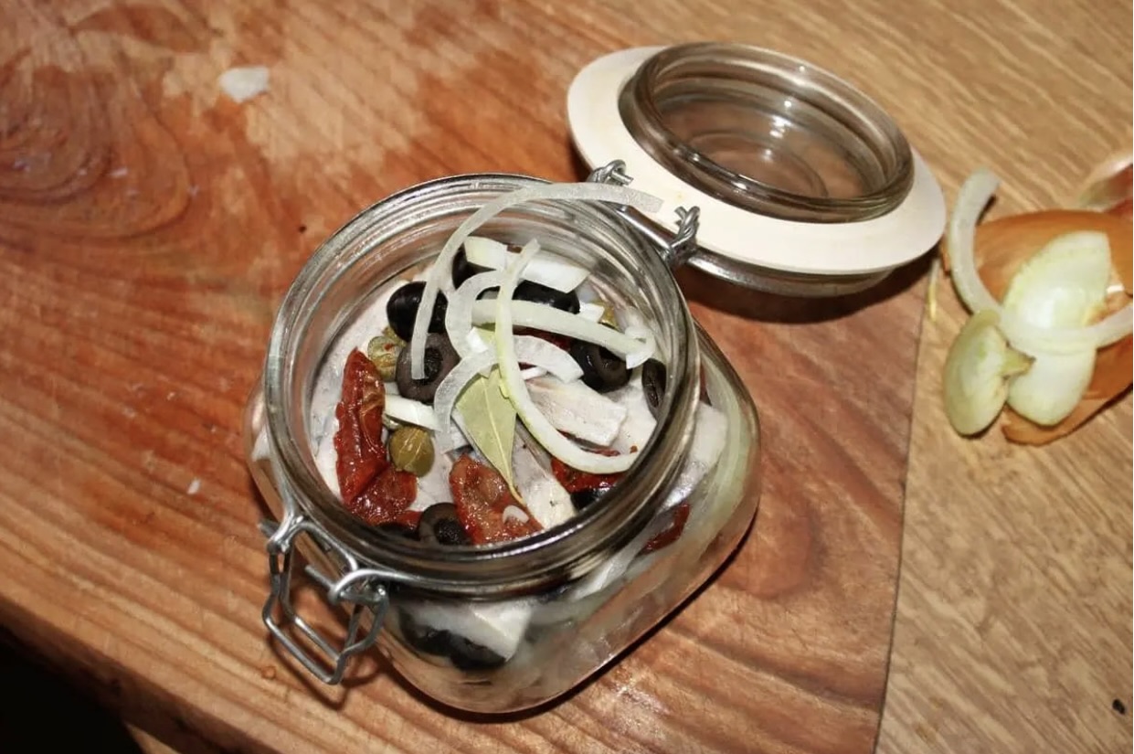 Układanie warstw: W małym słoiczku na dnie rozłóż nieco cebuli, a na nią nałóż porcję śledzi. Następnie dodaj trochę kaparów, oliwek i suszonych pomidorów. Do słoika włóż również liście laurowe, ziele angielskie i płatki suszonego chilli.