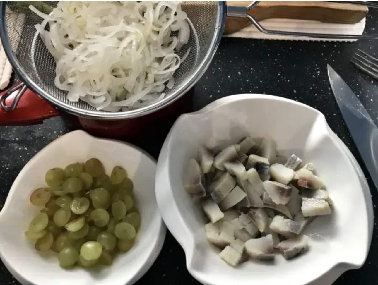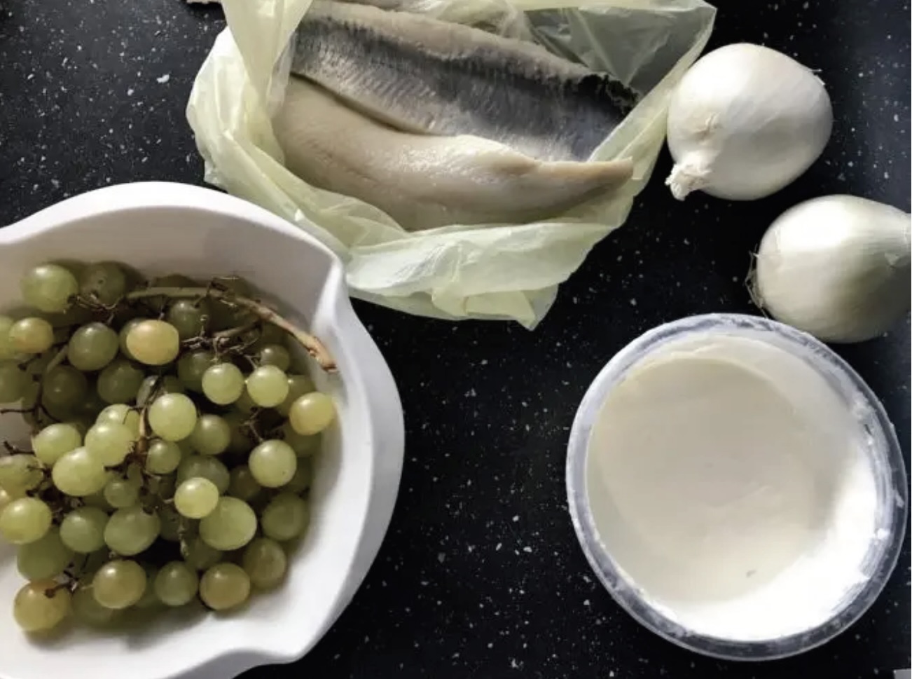 Śledzie w śmietanie z winogronami i białą cebulą