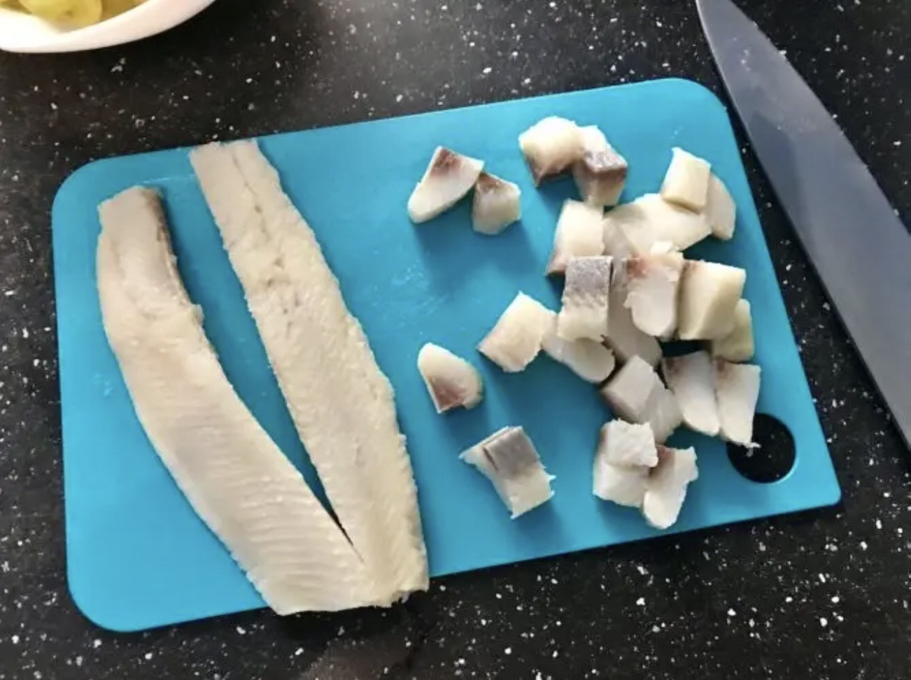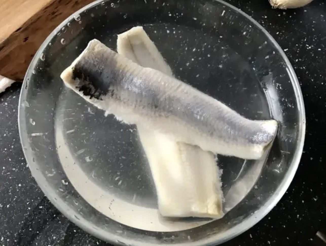 Śledzie: Moczyć śledzie w zimnej wodzie przez kilkanaście minut, aby pozbawić je nadmiaru słoności. Następnie dobrze osuszyć ręcznikami papierowymi i pokroić w małe kawałki.