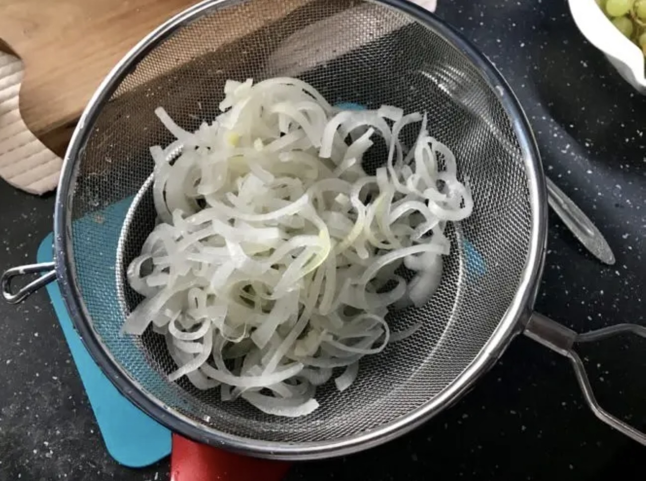 Cebula: Cebule obrać, pokroić w piórka i zalać wrzącą wodą. Po około 1 minucie odcedzić cebulę i obficie przelać zimną wodą. W ten sposób pozbawi się cebulę ostrości. Odłożyć na bok, aż całkiem przestygnie.