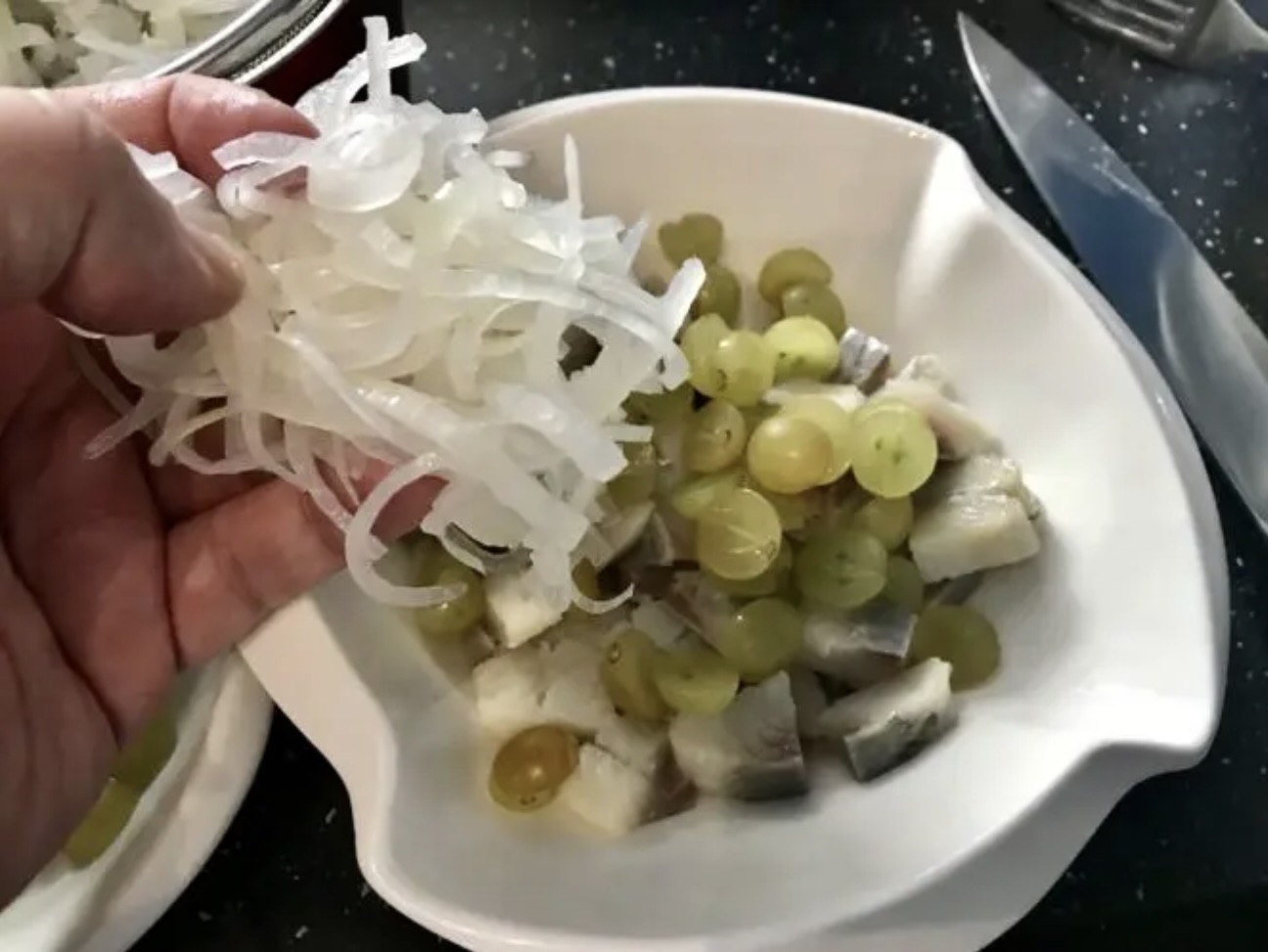 Łączenie: Śledzie, winogrona i ostudzoną cebulę włożyć do miski. Dodać gęstą, kwaśną śmietanę.