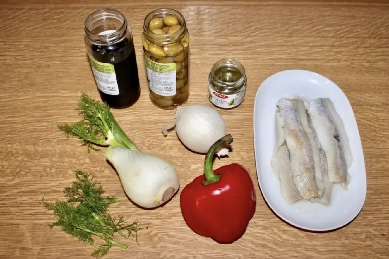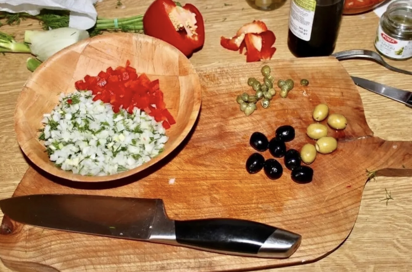 Wszystkie pokrojone składniki (cebulę, fenkuł, koperek, paprykę, oliwki, kapary) wymieszaj razem w osobnej misce.