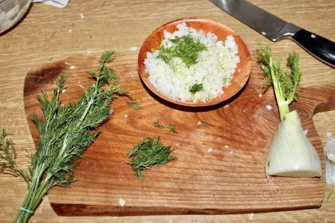 Koperek opłucz pod bieżącą wodą, przesiekaj i dodaj do pokrojonej cebuli i fenkułu.