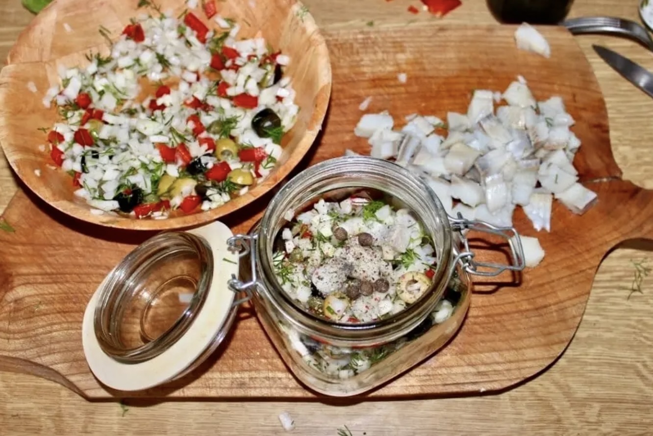 W małym słoiku układaj na przemian warstwy mieszanki warzywnej i kawałków śledzia.