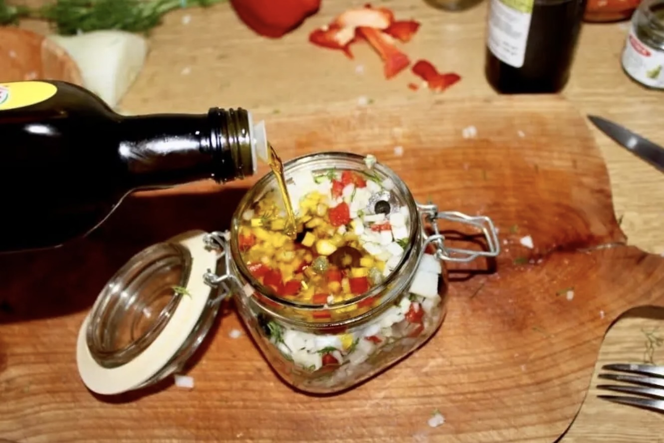 Zalej wszystko olejem, potrząsając słoiczkiem, aby olej oblepił każdy kawałek śledzia i warzyw.