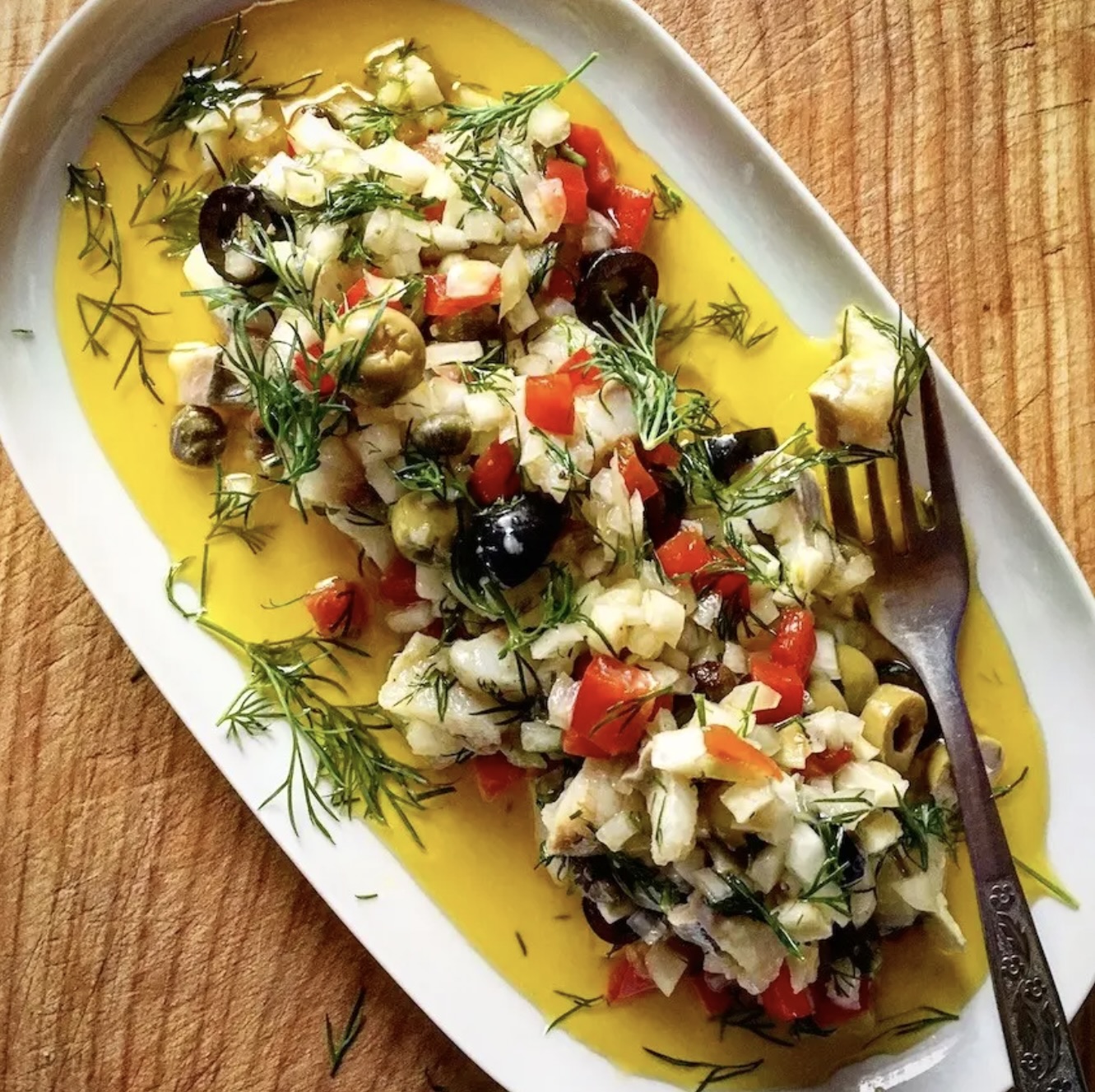 Śledzie z fenkułem to moja kolejna wersja „śledzi w oleju”. W tej wersji zamiast połowy cebuli dodałem bulwę kopru włoskiego, dzięki czemu śledzie nabrały lekkiego, anyżkowego posmaku. Wiem, że tego posmaku nie lubi znaczna część osób, ale uwierz, te śledzie naprawdę mają jedynie lekką nutę anyżu. Nie mogło oczywiście zabraknąć natki kopru, która z niewiadomych dla mnie przyczyn nie jest u nas dostępna w pęczkach. No i w takim „greckim” zestawieniu ziele angielskie stało się oczywistą oczywistością.
